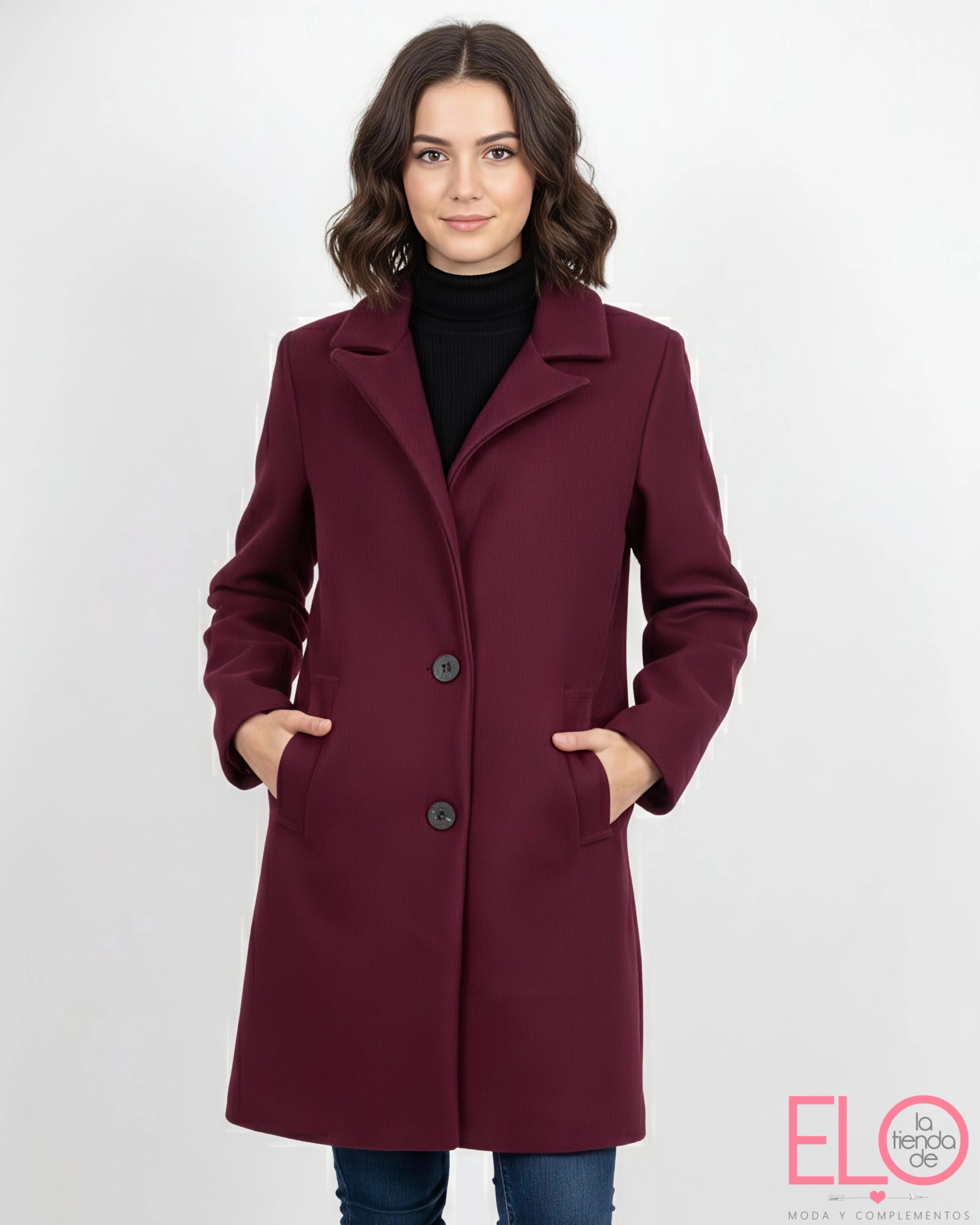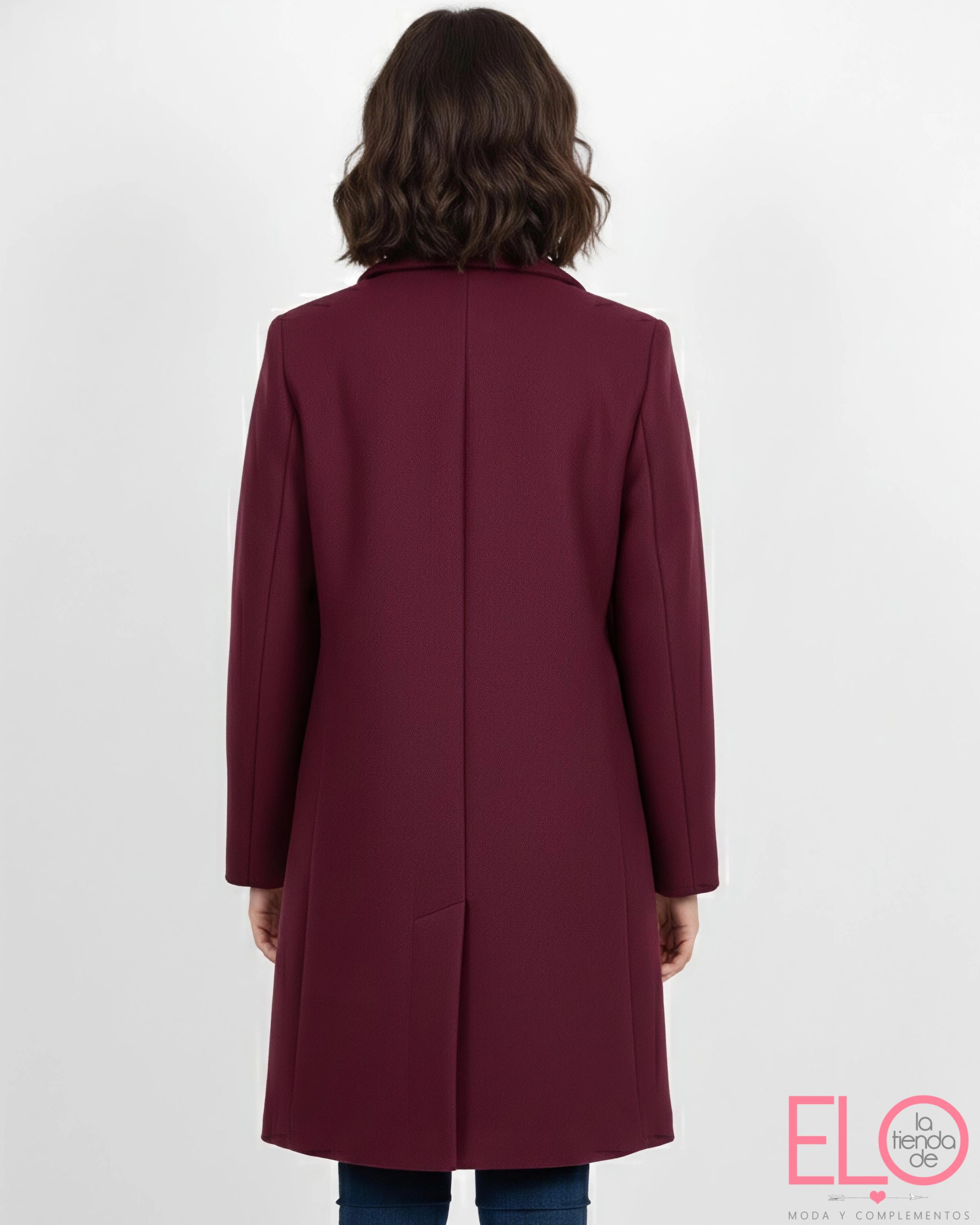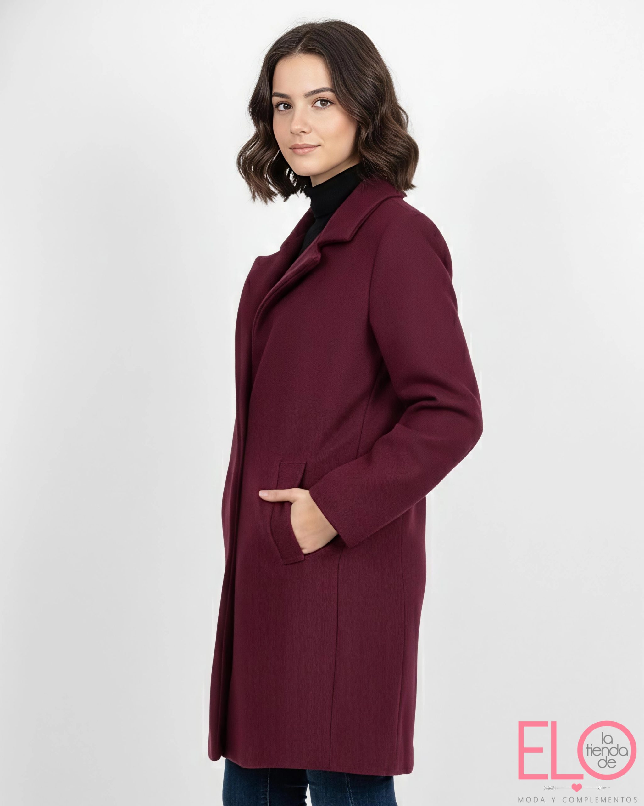 Abrigo de paño en color burdeos con diseño clásico, con dos bolsillos laterales y botonadura central.