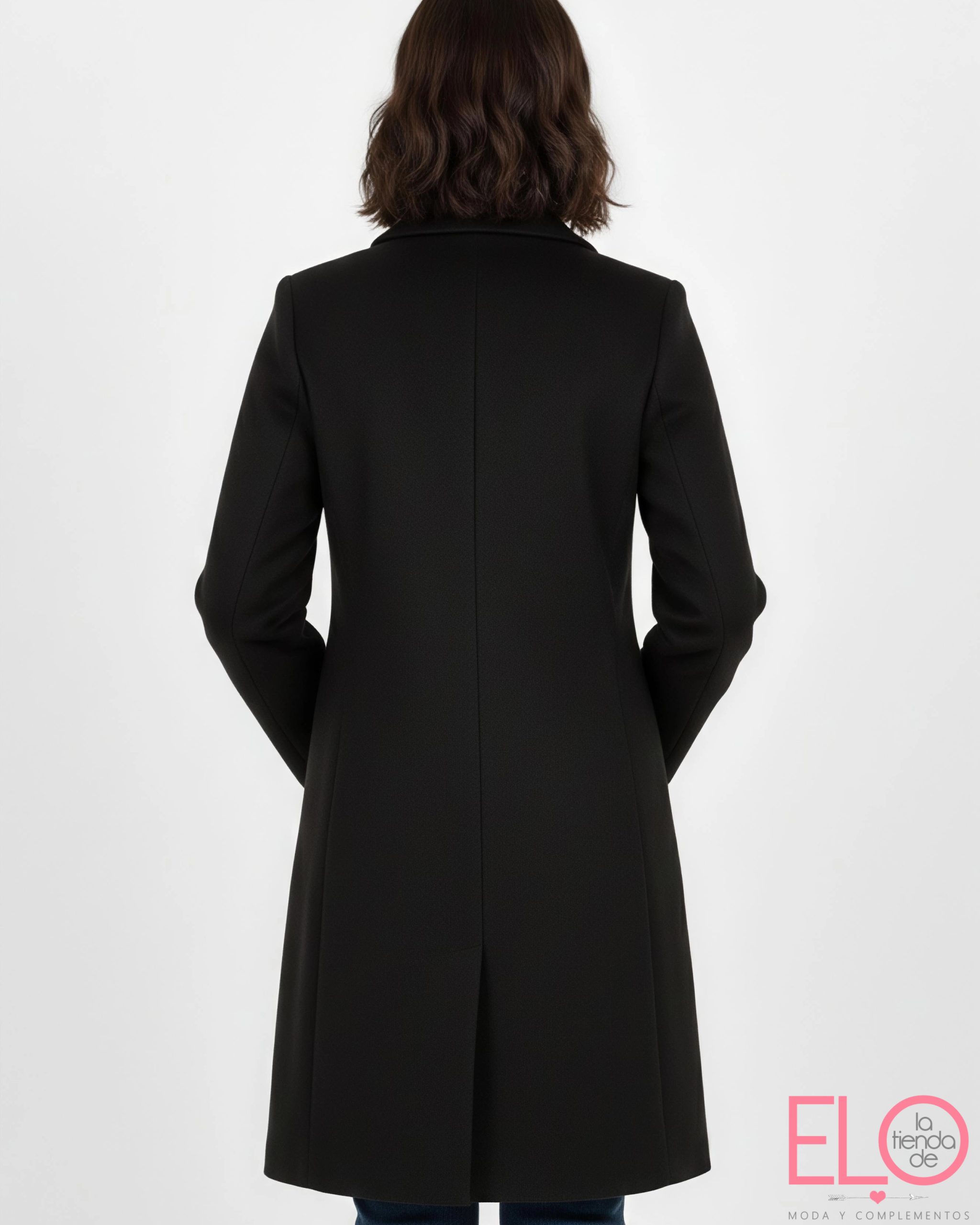 Abrigo de paño en color negro con diseño clásico, con dos bolsillos laterales y botonadura central.