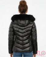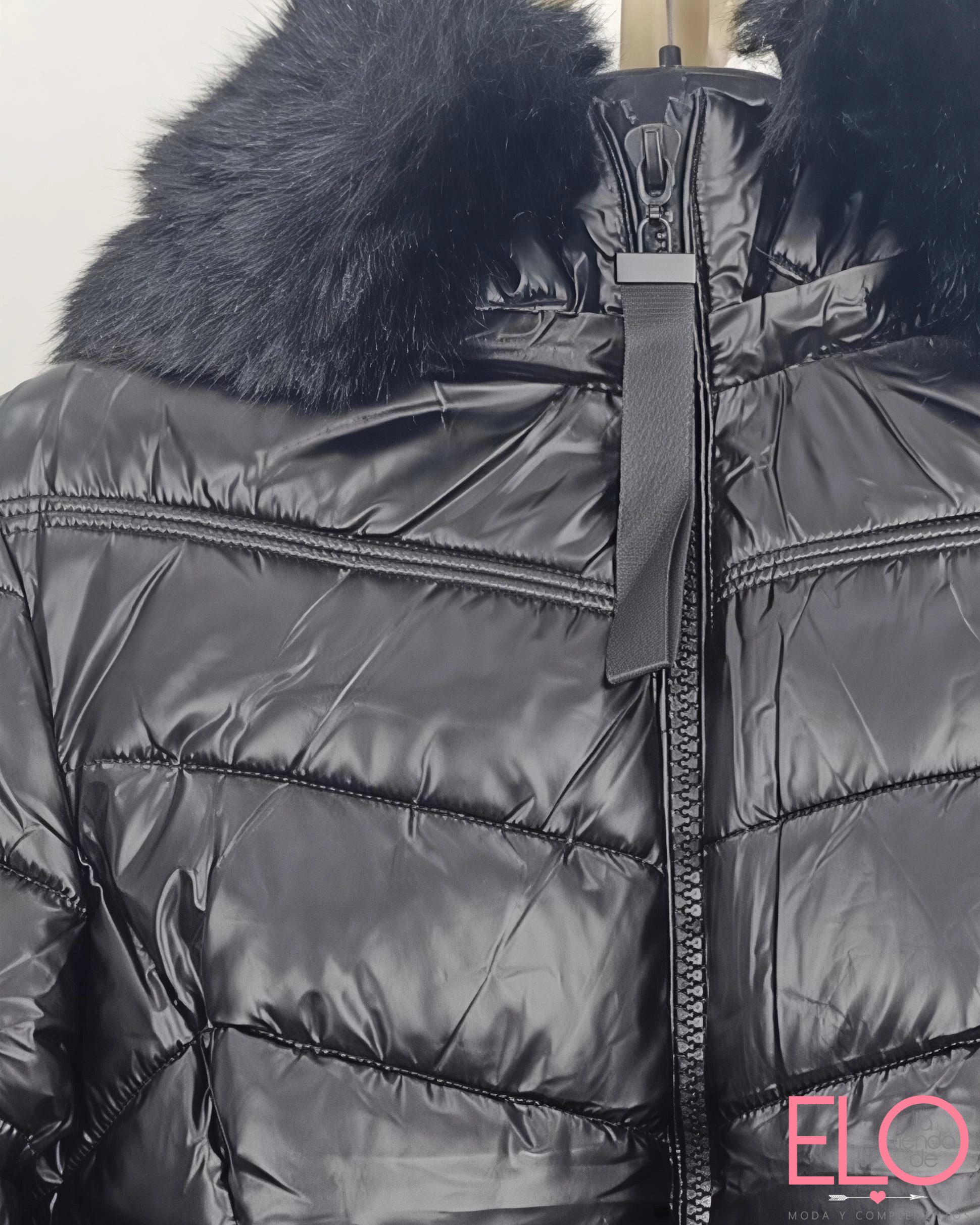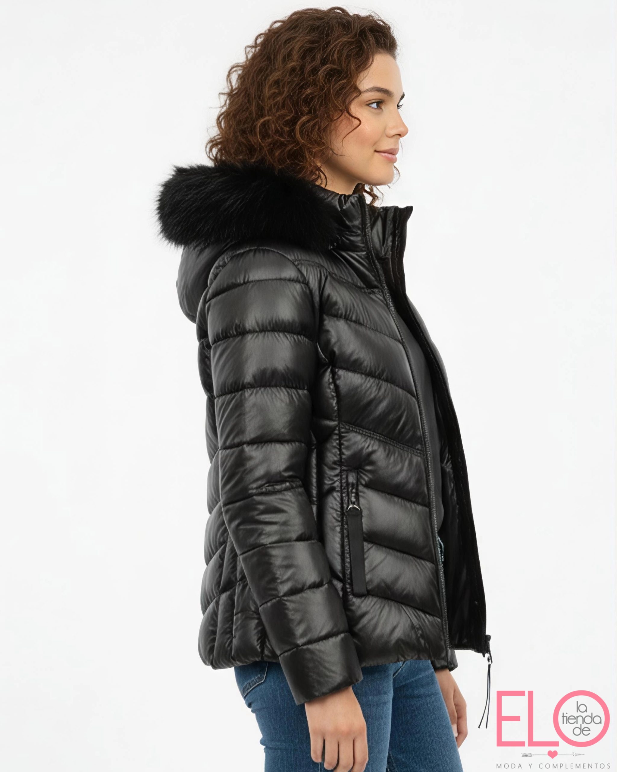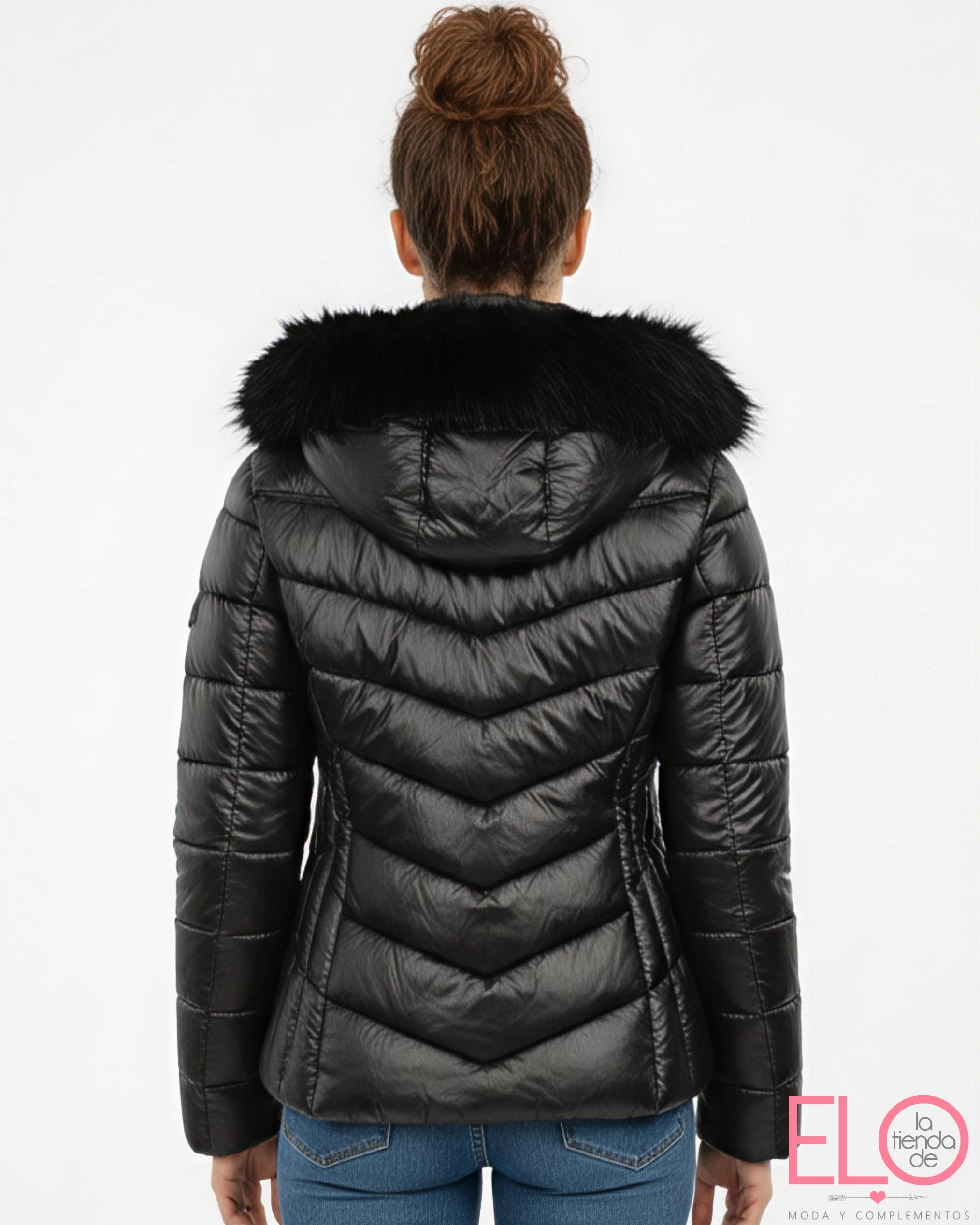 Anorak negro acolchado, con efecto brillante en el tejido.