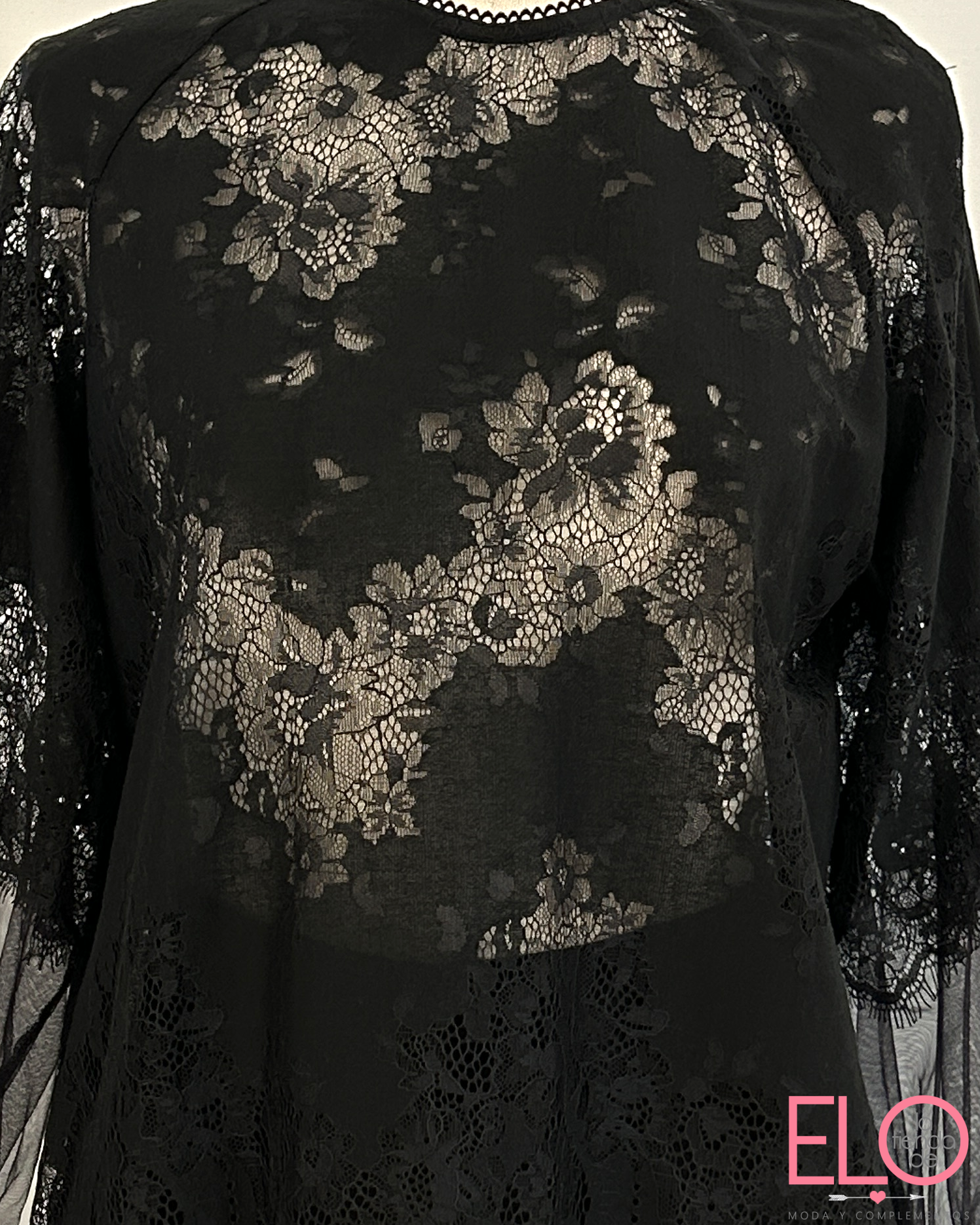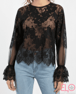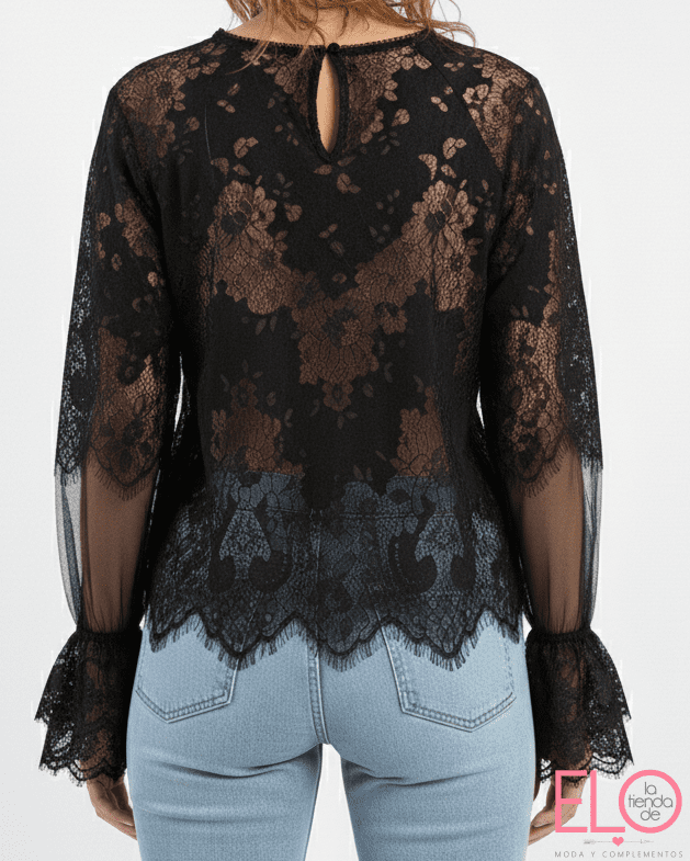 Blusa bordada con encaje lencero de color negro.