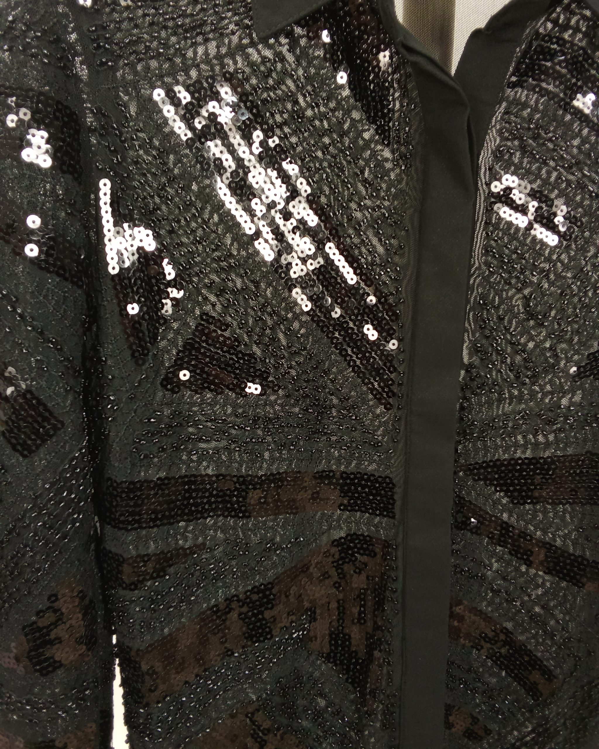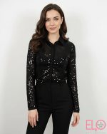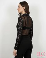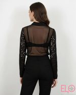 Body de color negro en tul, con bordado de lentejuelas y piedras negras.