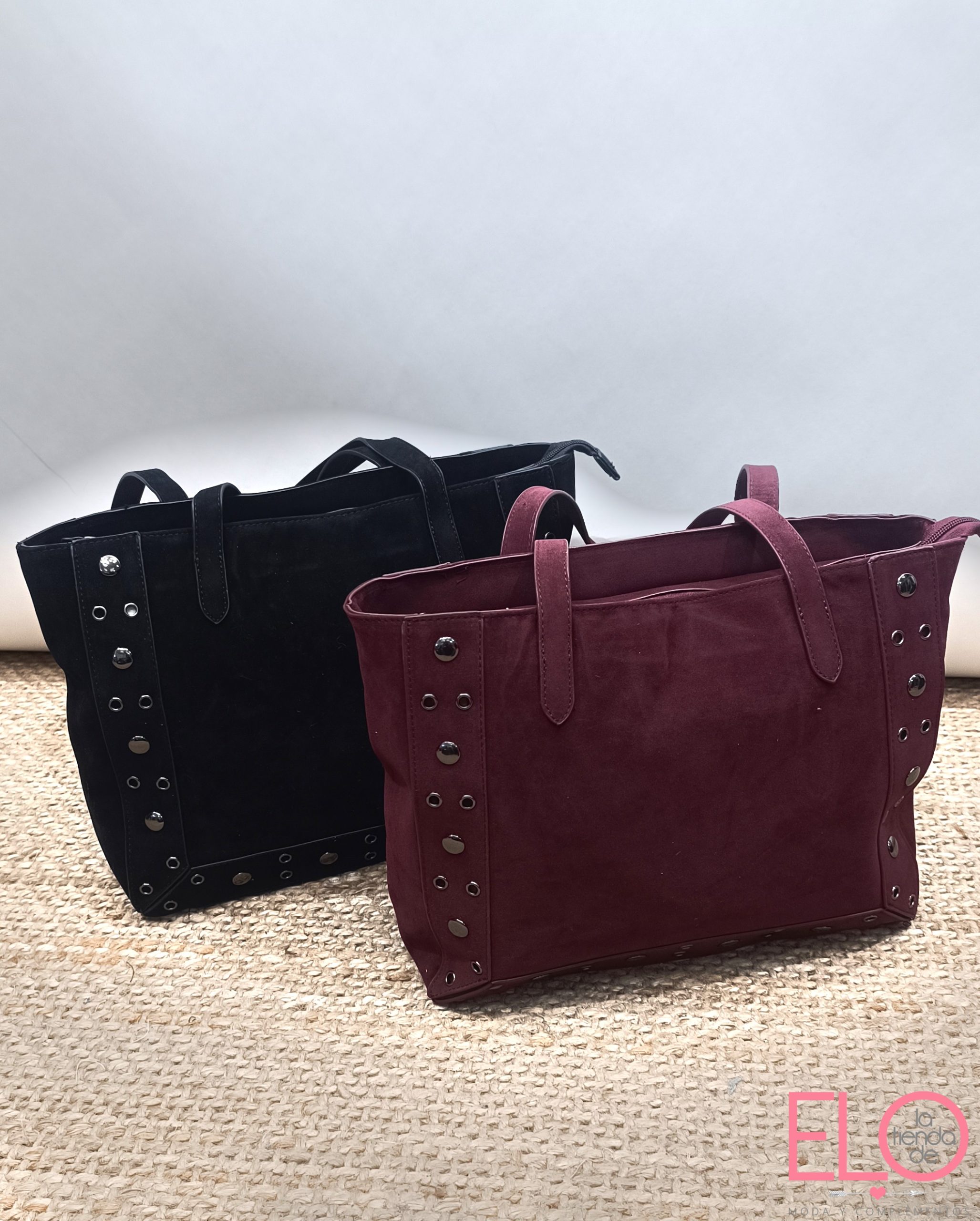 Bolso de tejido tipo ante con detalle de tachuelas en los laterales