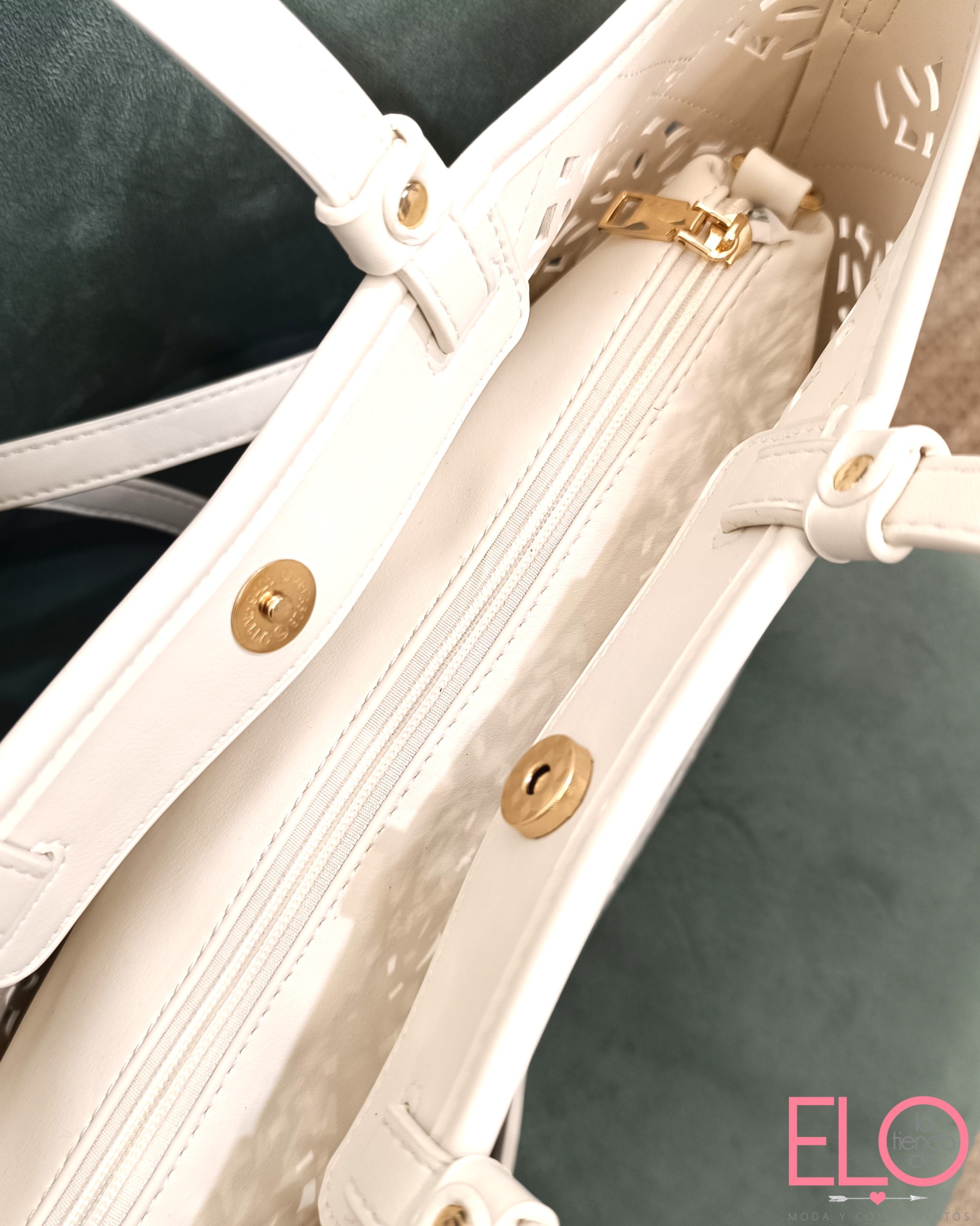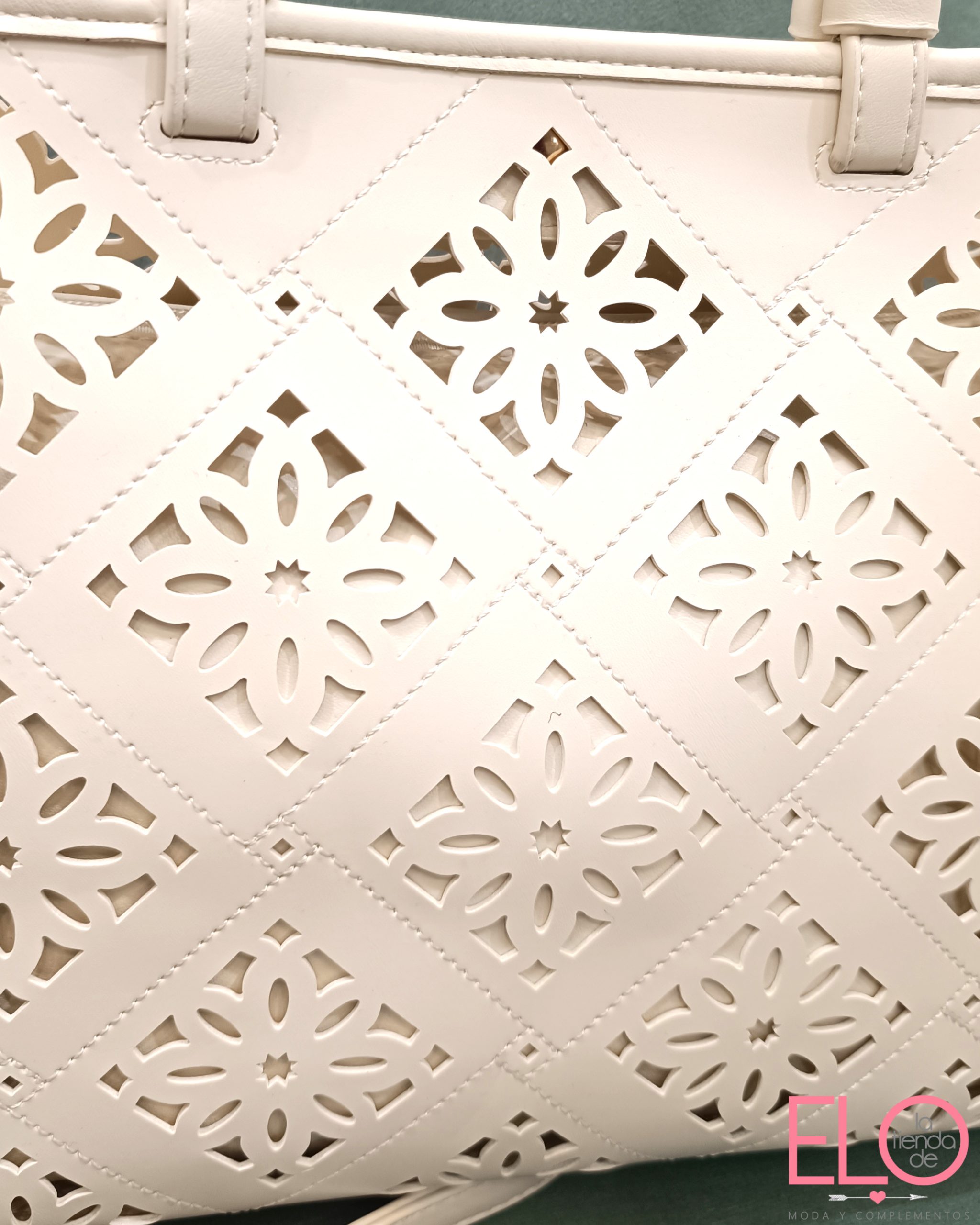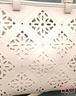 Bolso de polipiel blanco, con troquelados en forma de flor. Incorpora un bolsito amarillo liso dentro, lleva asa larga