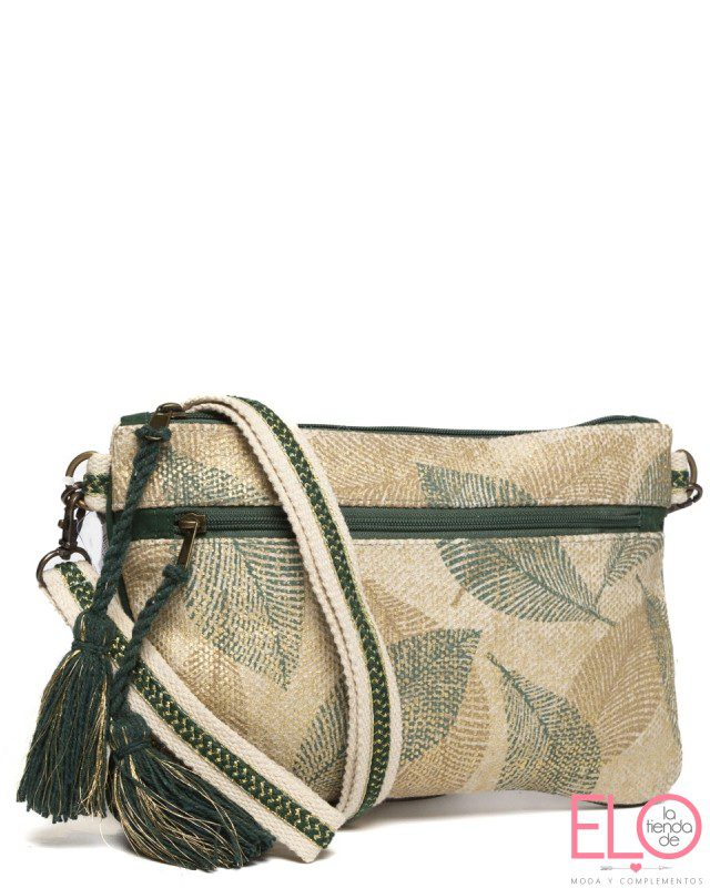 Bolso clutch de algodón estampado con motivo de hojas. bolsillo frontal. con cremallera. asa larga regulable y asa corta de algodón. ambas desmontables. en un color: verde. una pieza. Medidas: 30 x 20 cm. Composición: Ext: 100º/ₒ algodón. Int: 100º/ₒ poliéster.