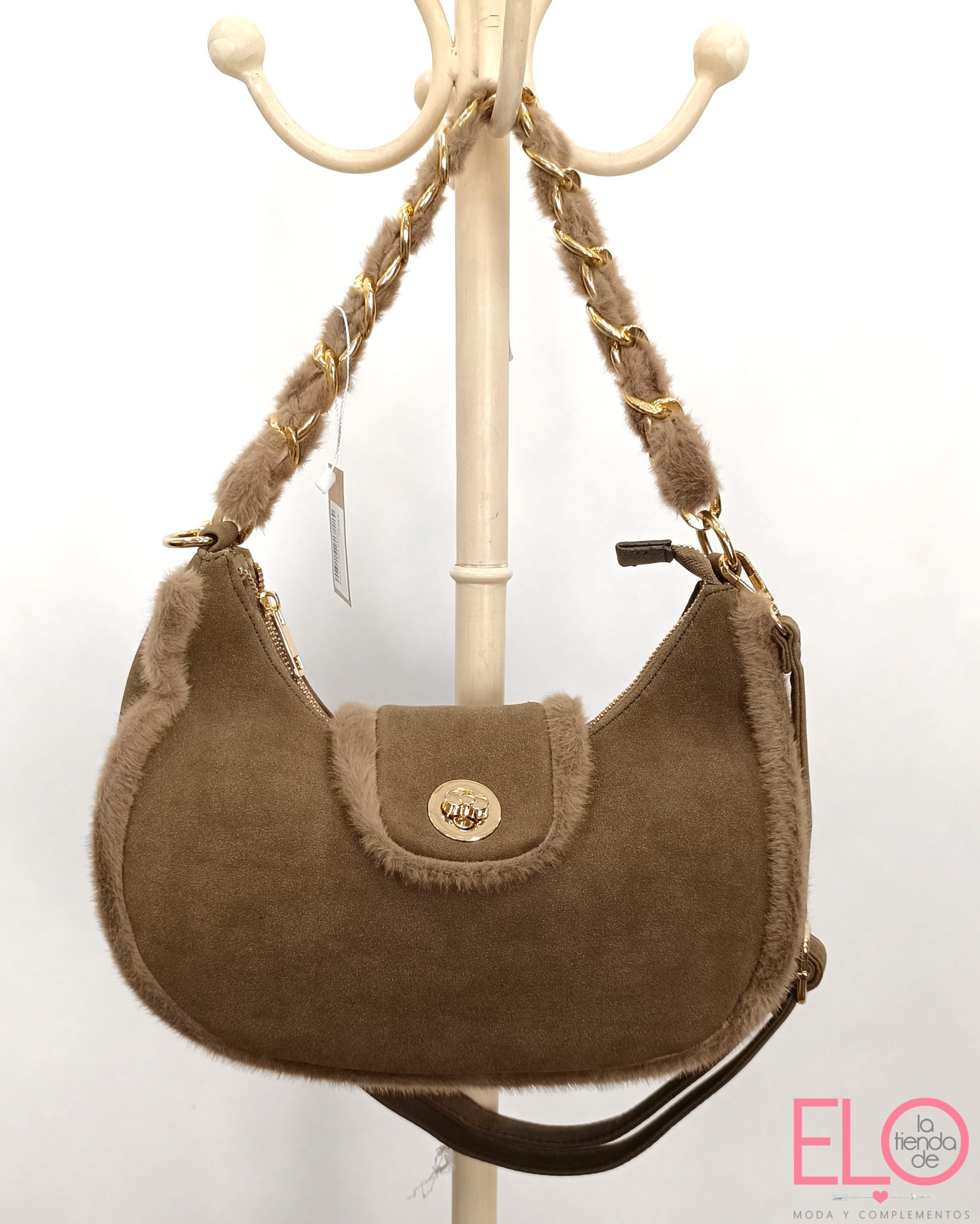 Bolso de tejido tipo antelina con detalle de tachuelas oro y flecos en los laterales. La cadena es combinada caqui y oro.
