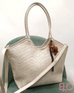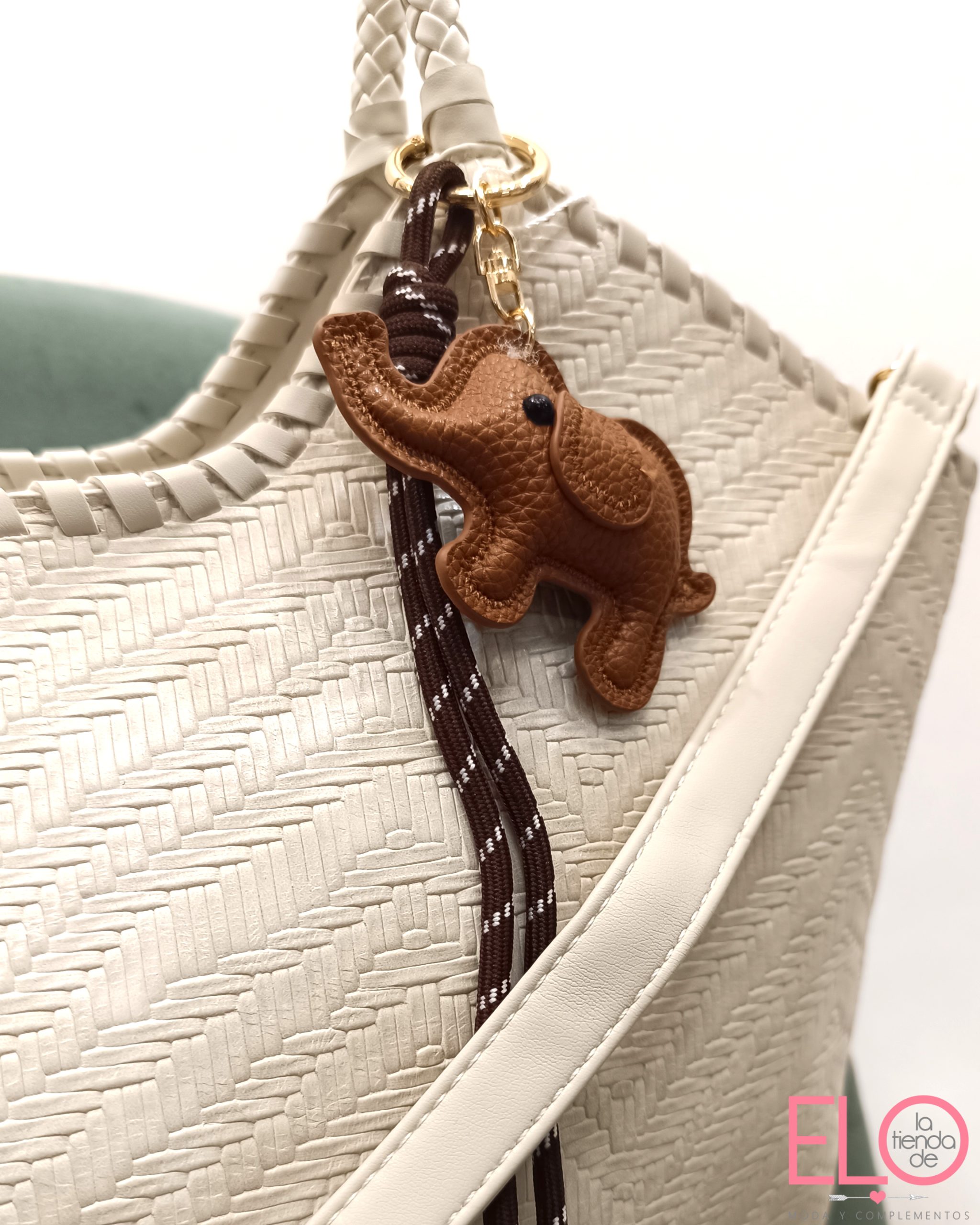 Bolso de color beige en polipiel, de tamaño grande, incorpora asa larga. Y llavero de forma de elefante en color camel