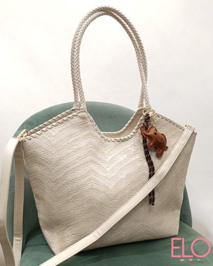 Bolso de color beige en polipiel, de tamaño mediano, incorpora asa larga. Y llavero de forma de elefante en color camel