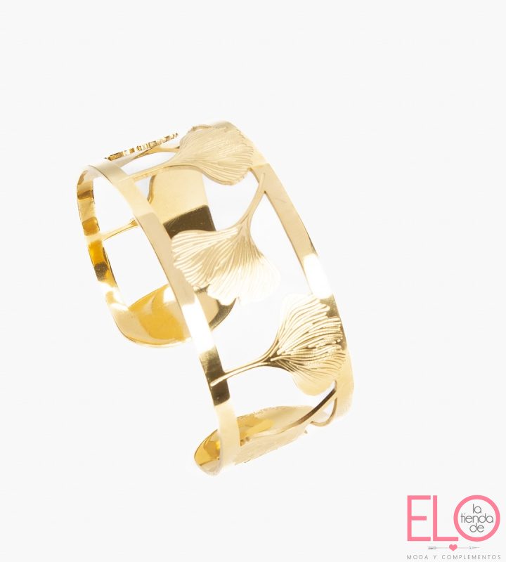Pulsera ajustable calada con motivos de hojas, en acero inoxidable con baño de oro de 14K.
