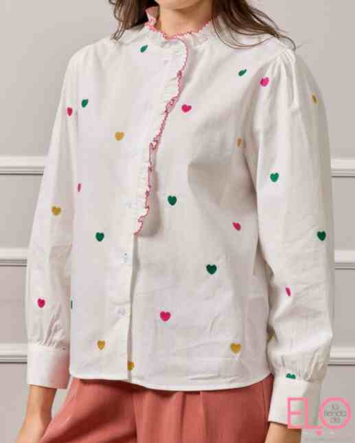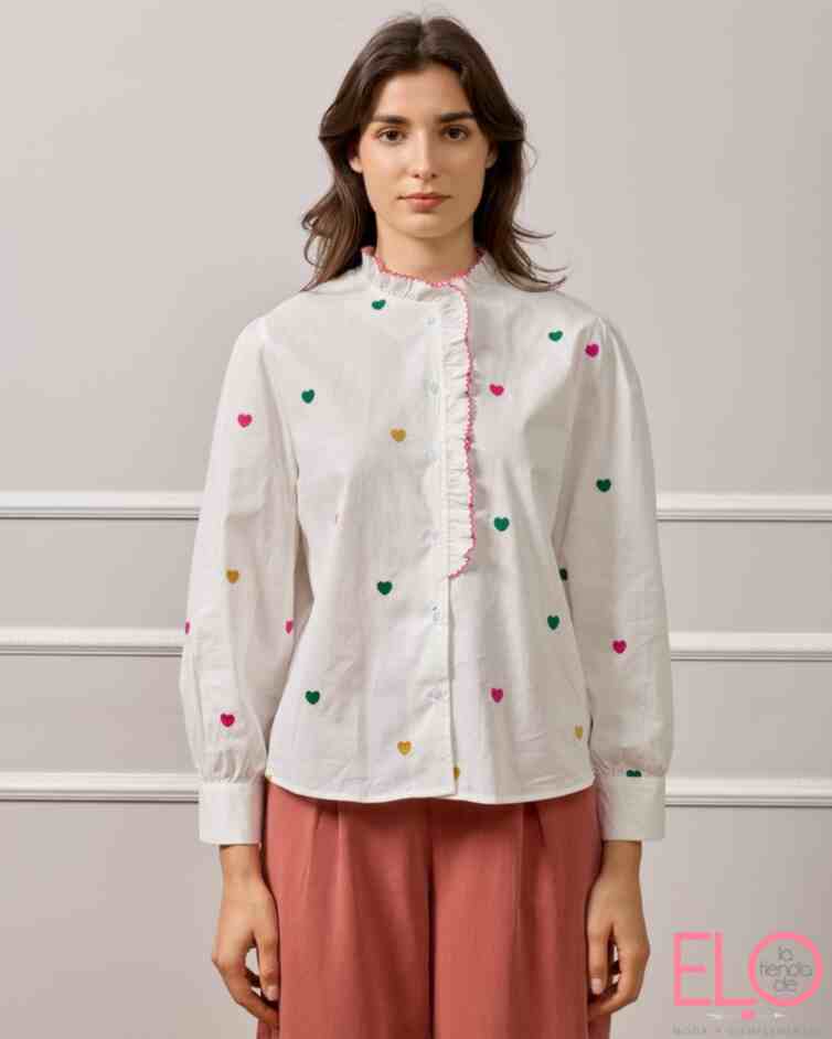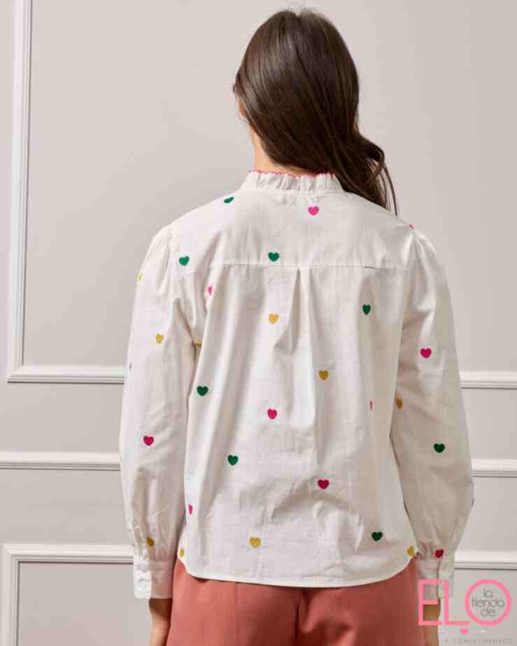 Camisa blanca con bordado de corazones de colores.
