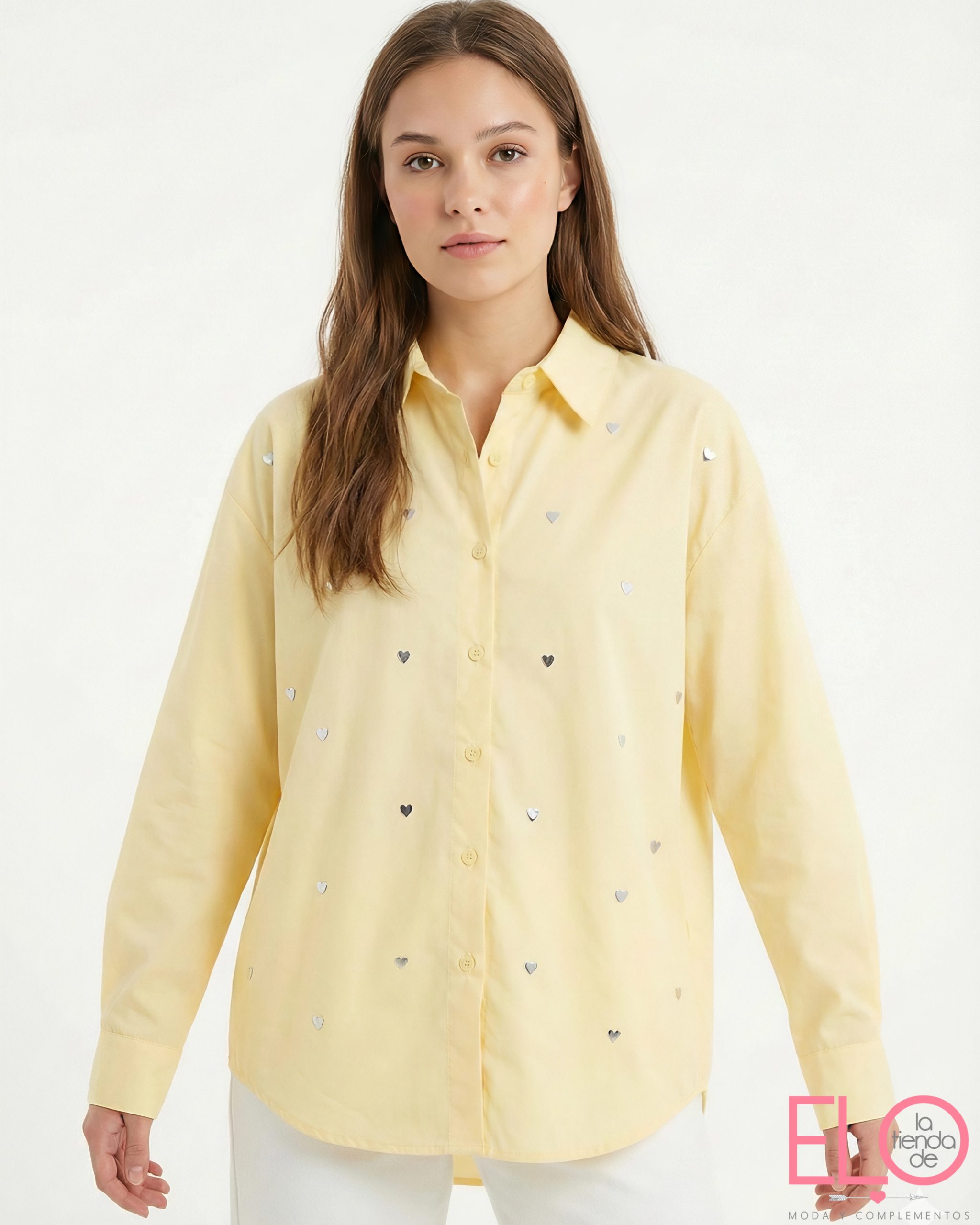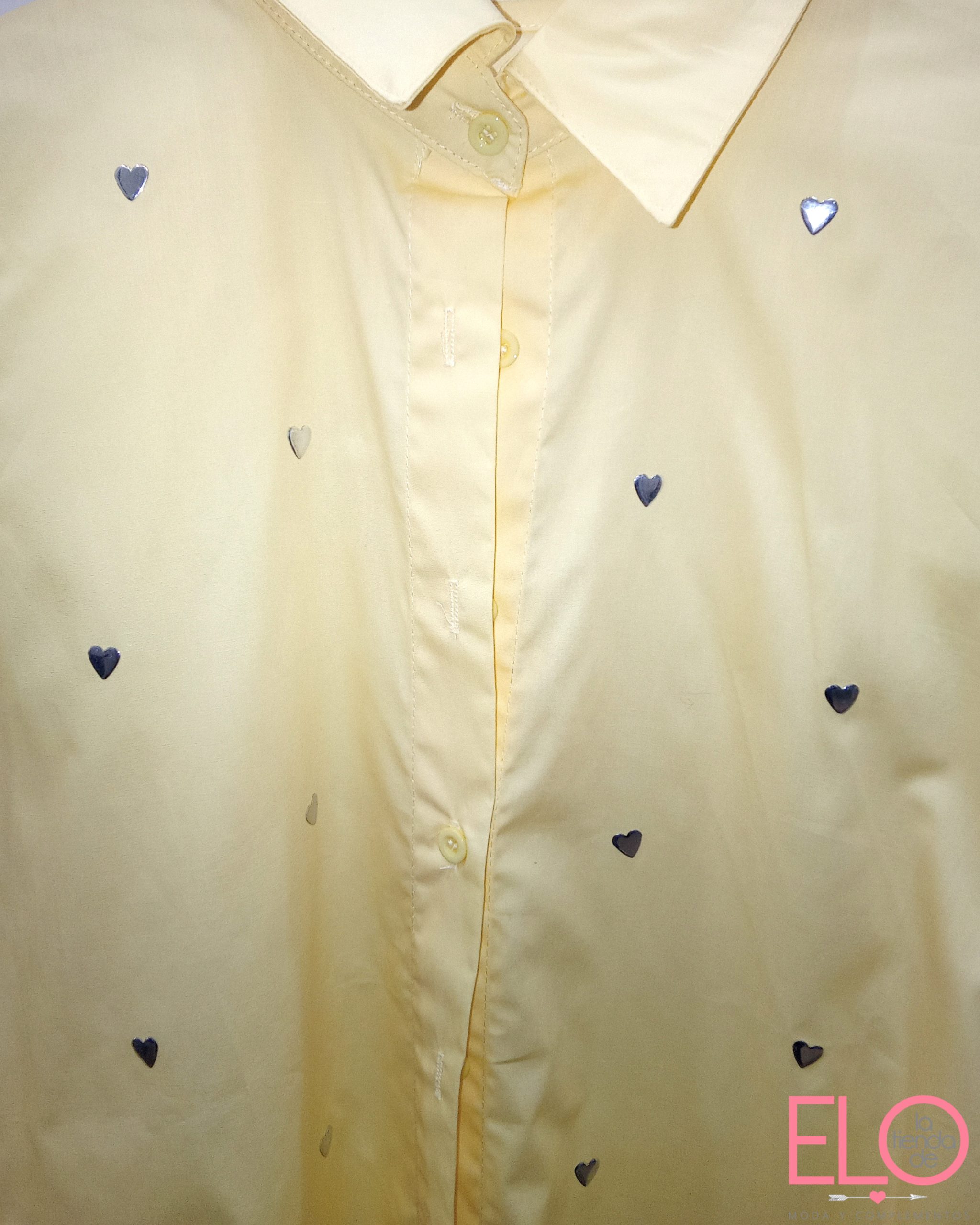 Camisa de color amarillo con detalle de corazones de color plata en el tejido.