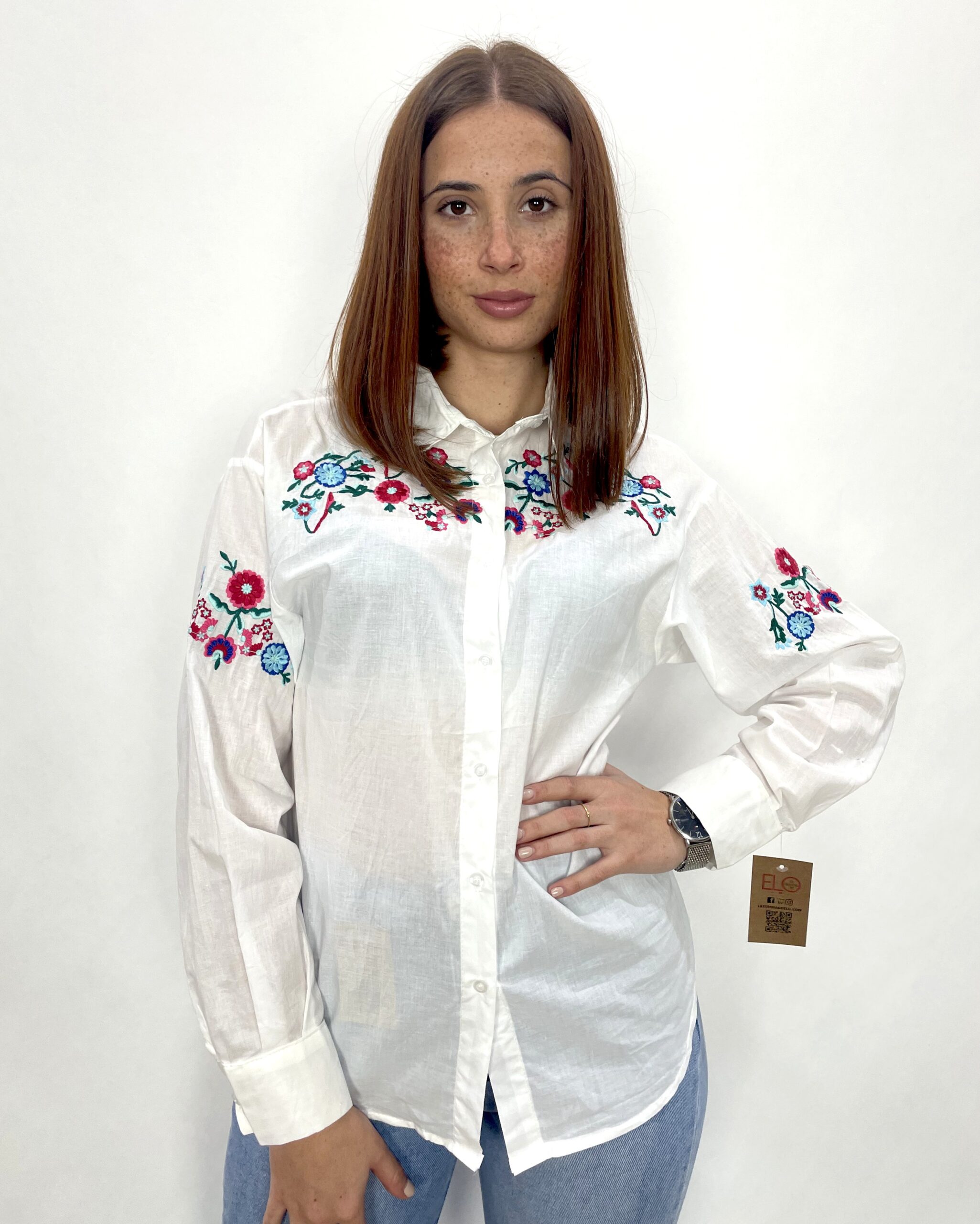 Camisa con bordado floral en tonos verdes, rosa y azul.