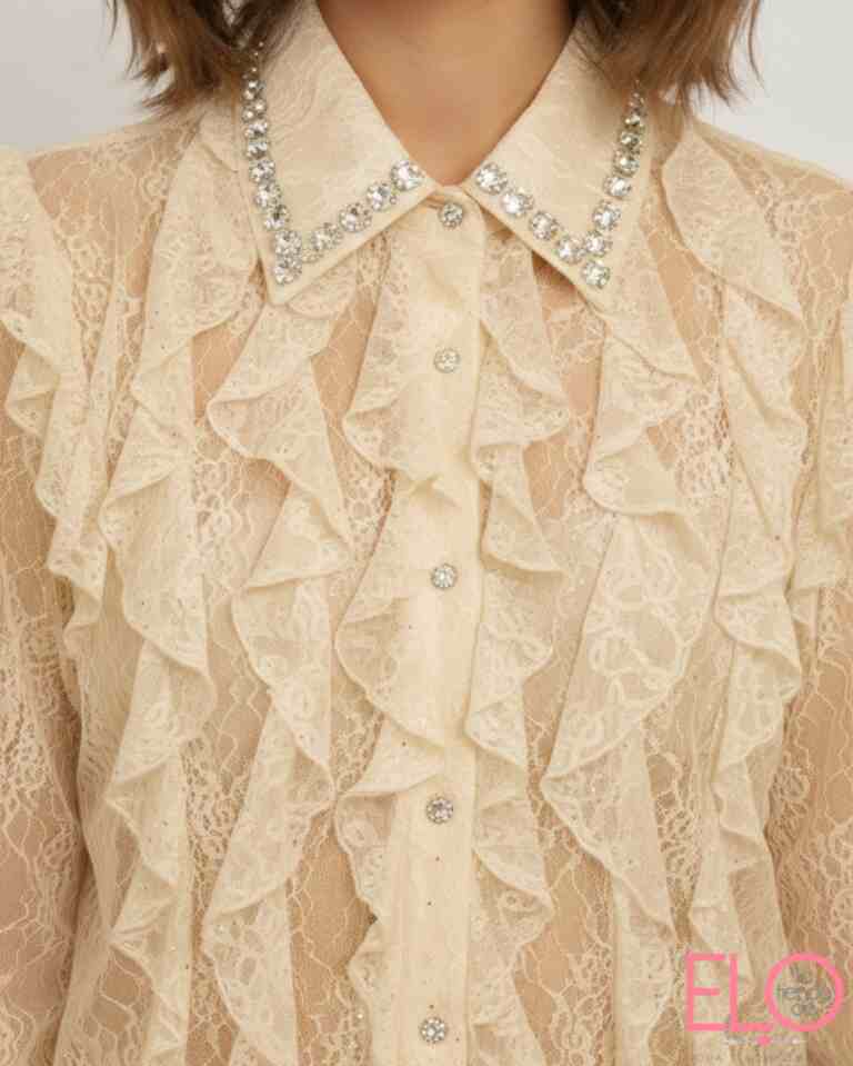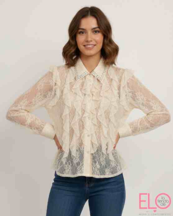 Lleva en el cuello pidrecitas de brillo, y sobre todo el tejido de encaje de la camisa piedrecitas de strass pequeñitas que le dan un aire mas sofisticado.