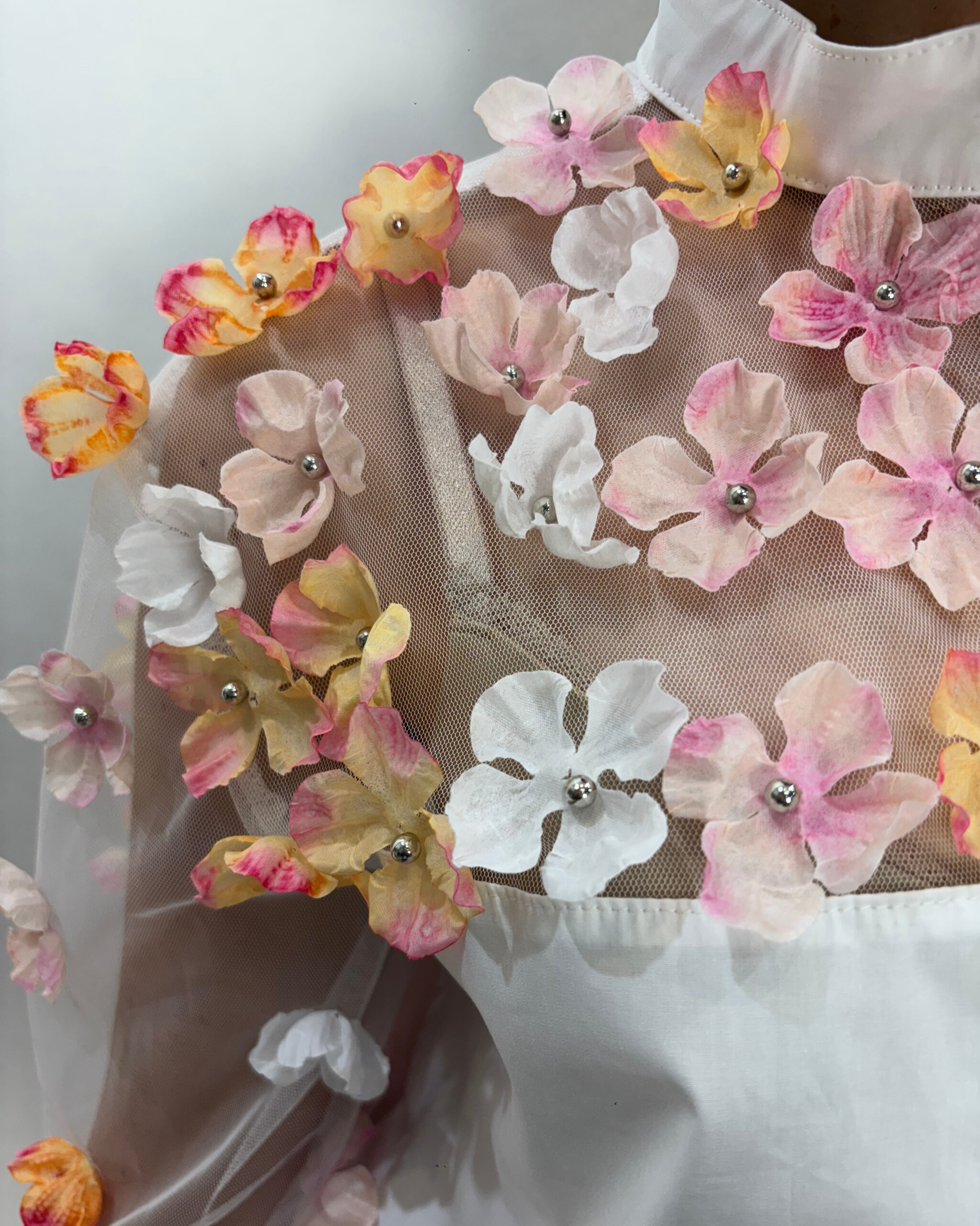 Tiene aplique de flores rosas y amarillas con perlas.