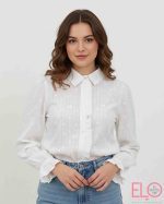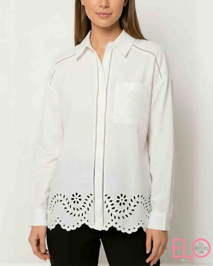 Camisa blanca con bordado de corazones y con lineas de hilo azul.