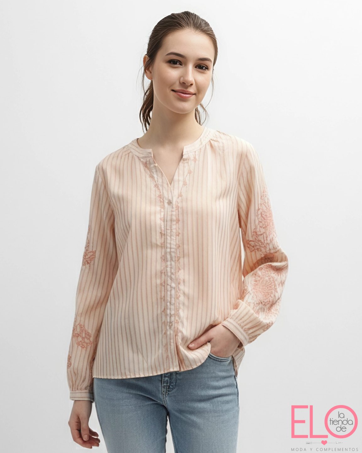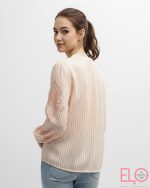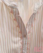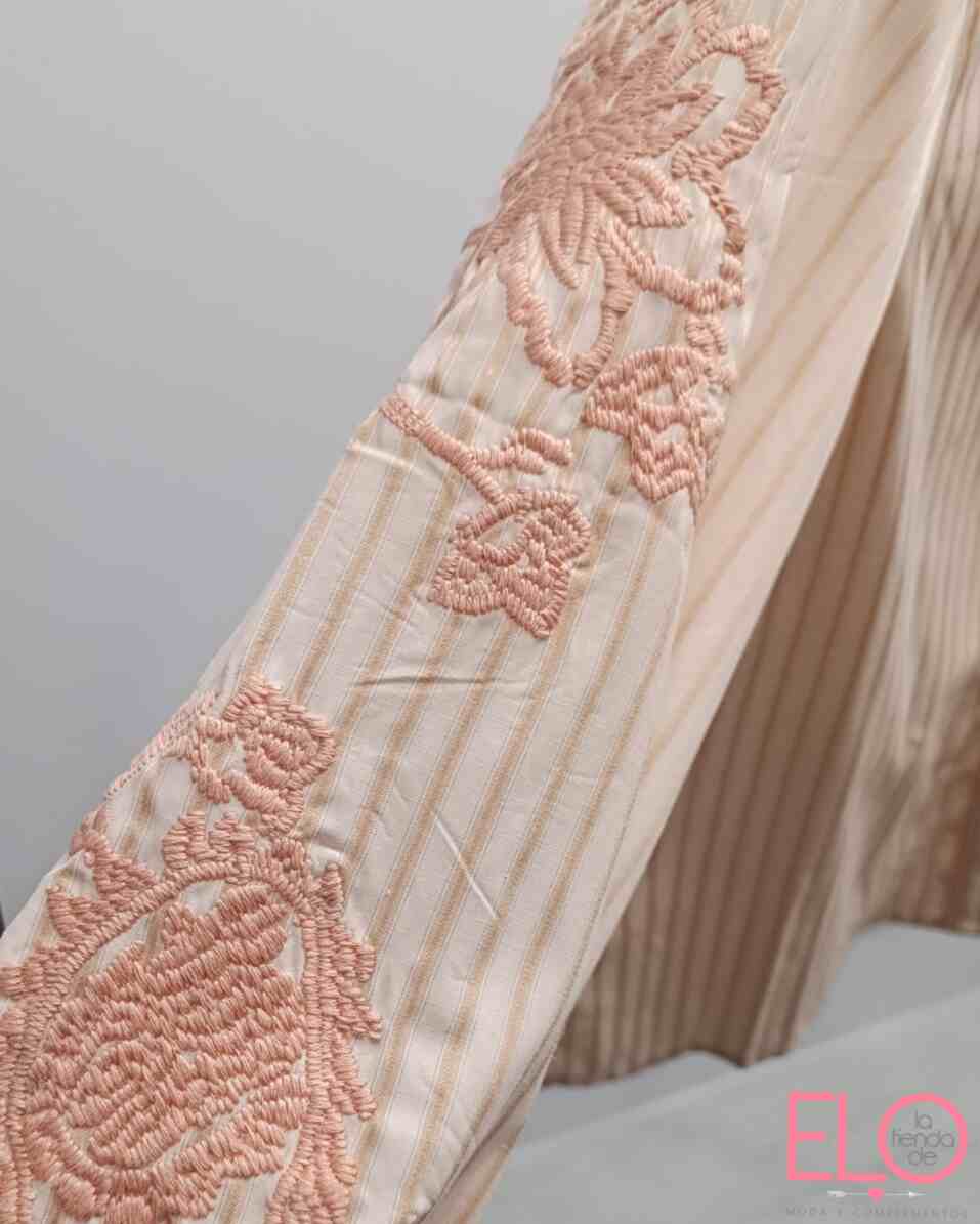 Camisa de color salmón con rayas y bordado en las mangas y en el centro.