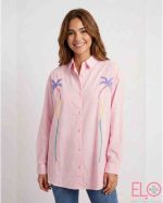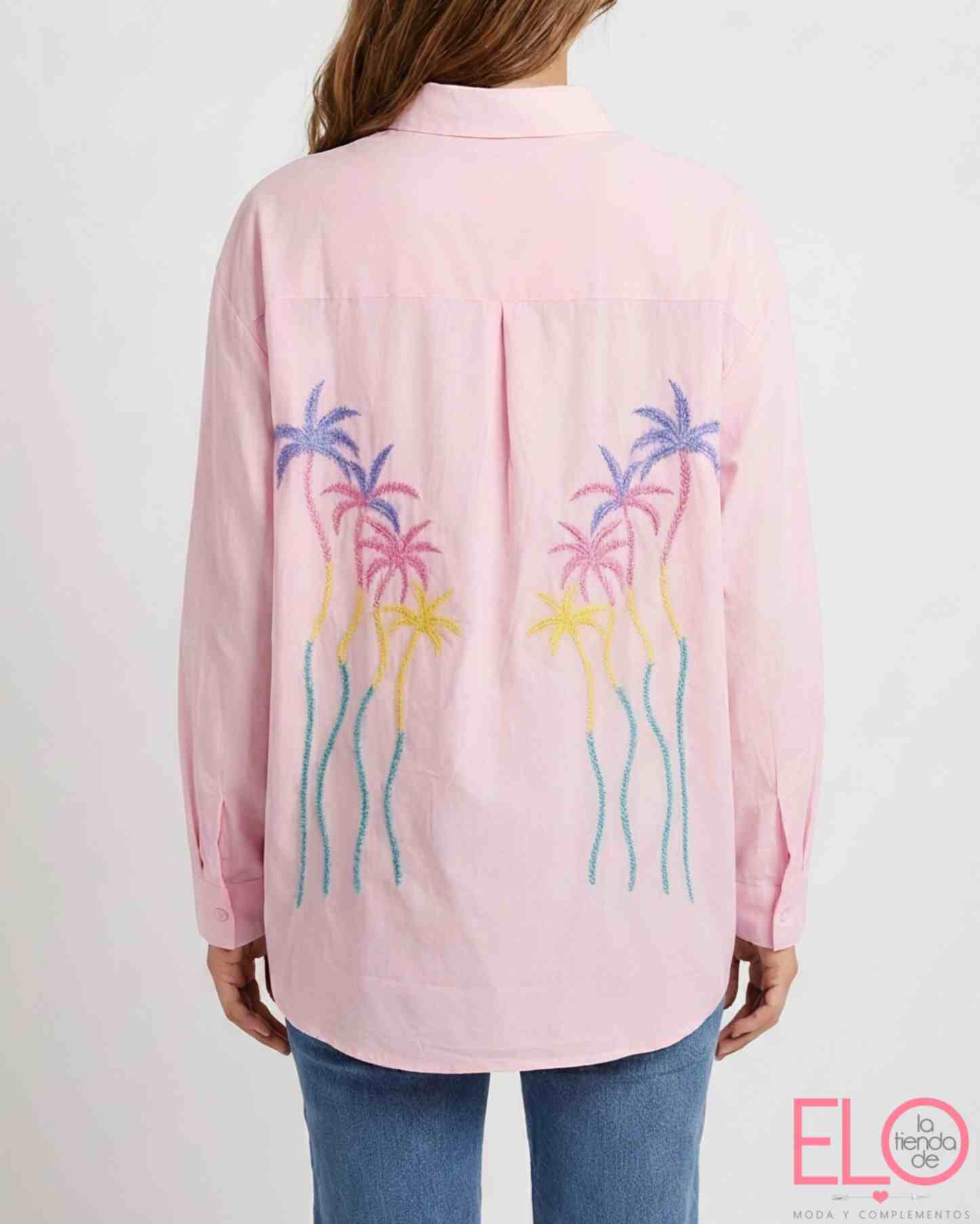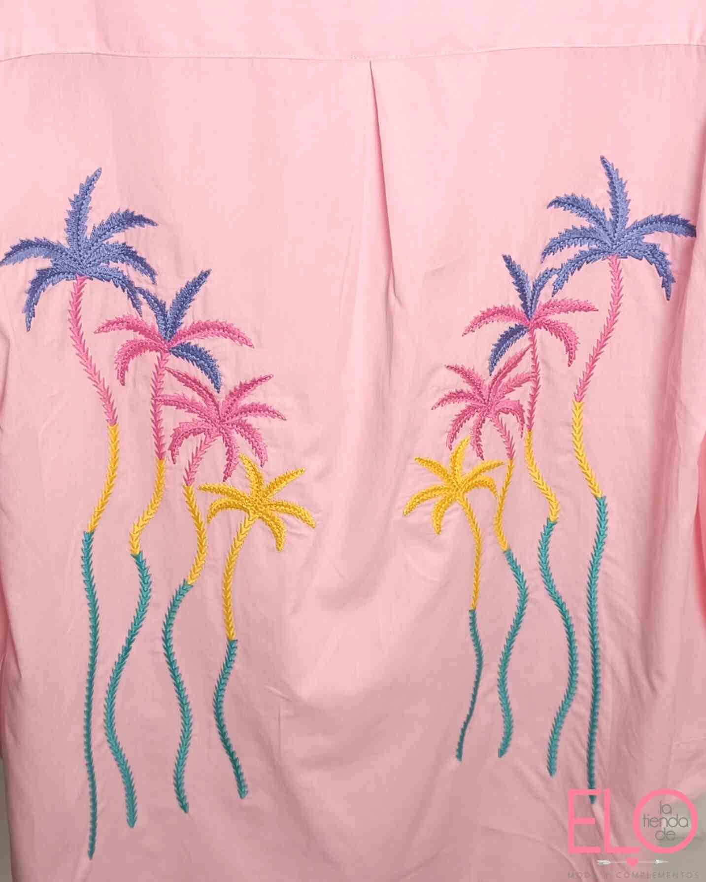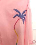 Camisa de color rosa con bordado de palmeras de colores.