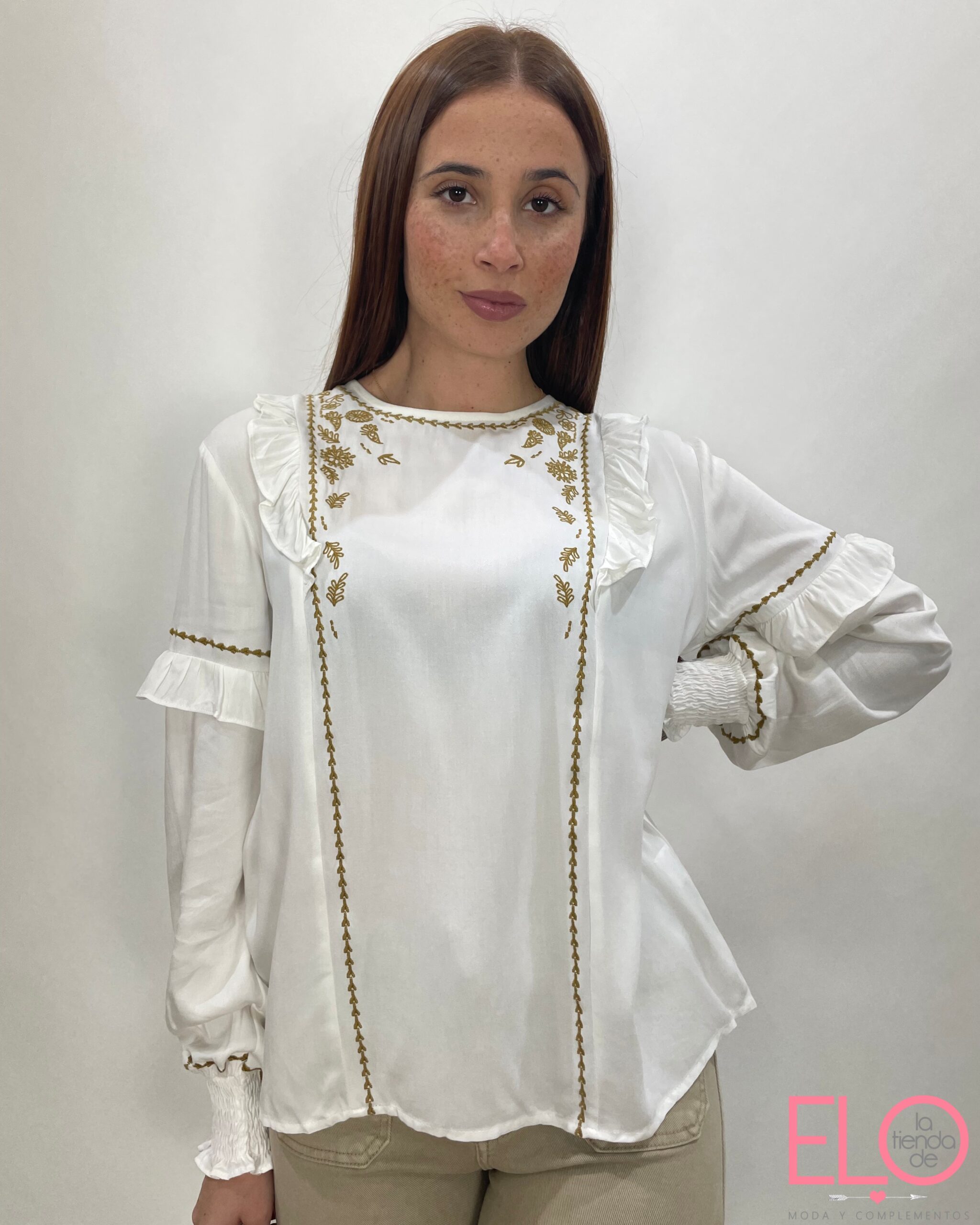 Camisa blanca con volantes en el pecho.