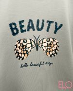 Con estampado de una mariposa beige, decorada con piedras verdes.