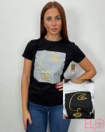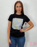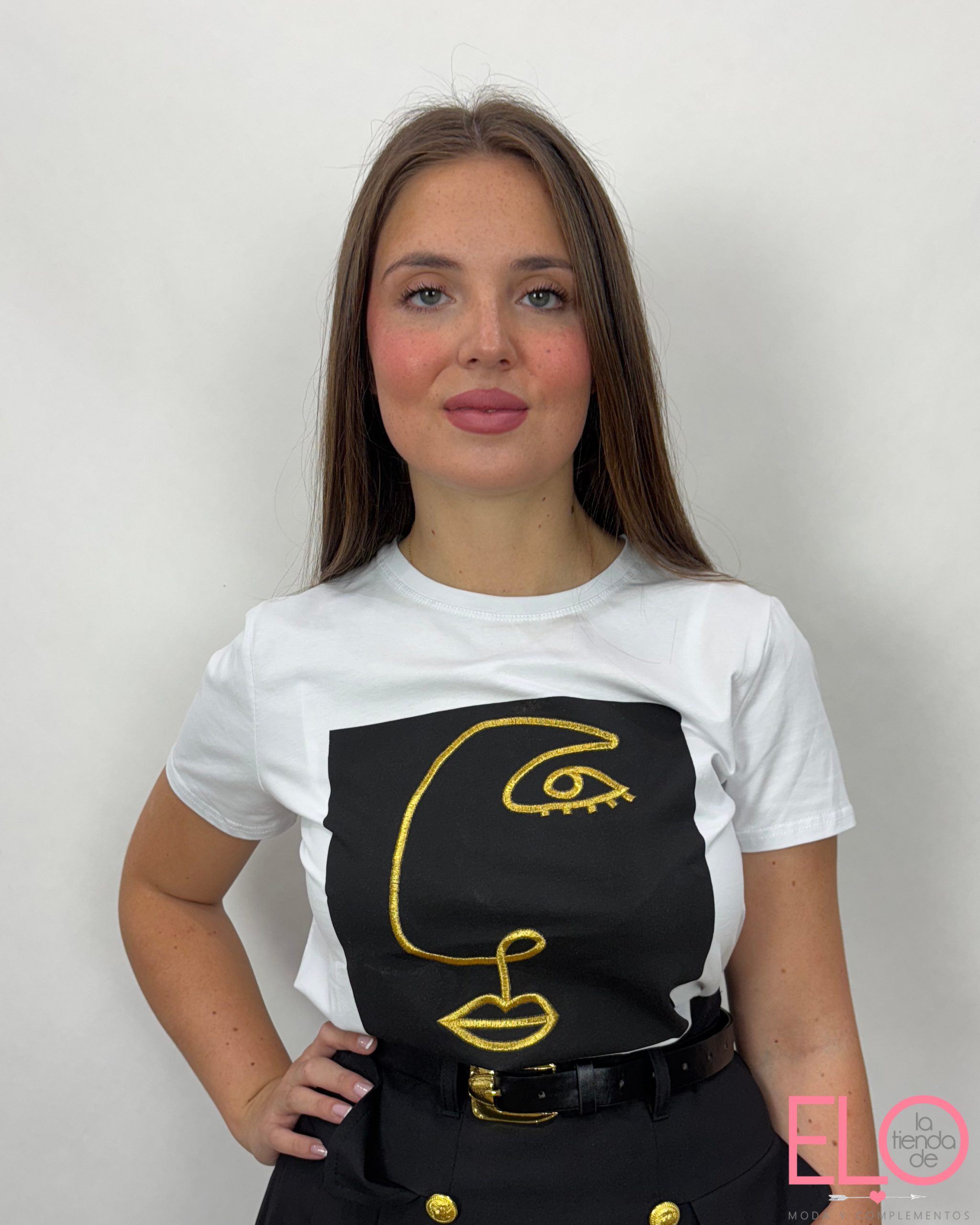 Lleva estampado de un cuadro en el frente con un bordado de un rostro en color dorado.