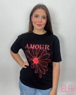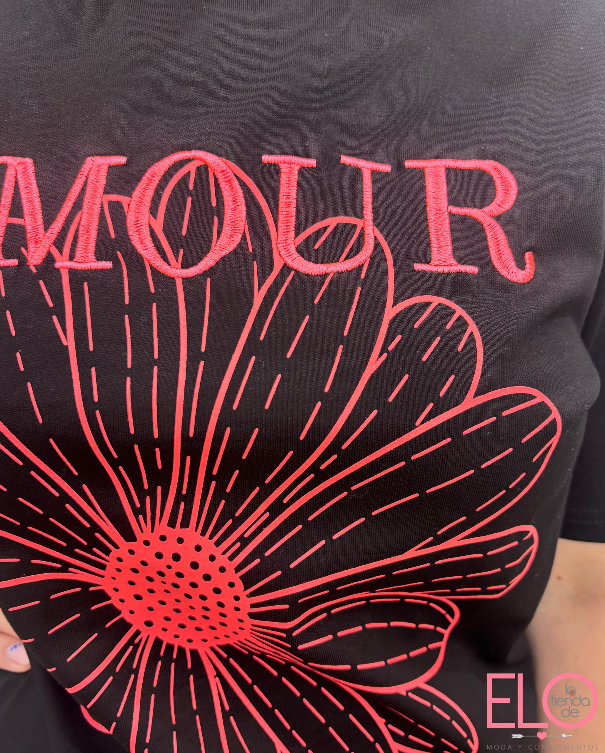 Camiseta negra con estampado de una flor fucsia y letras bordadas.