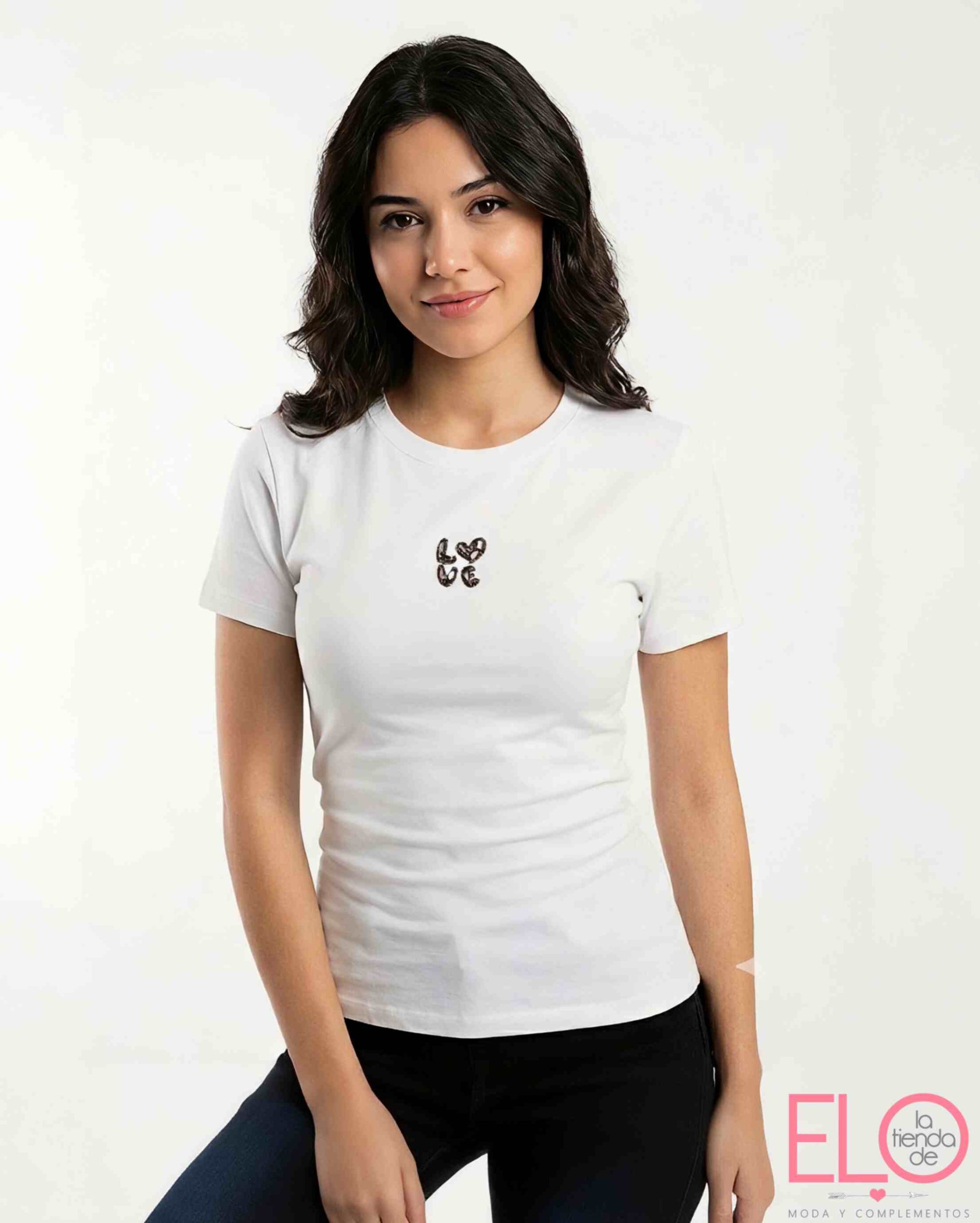 Camiseta básica con detalle de piedrecitas formando la palabra de love.