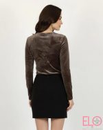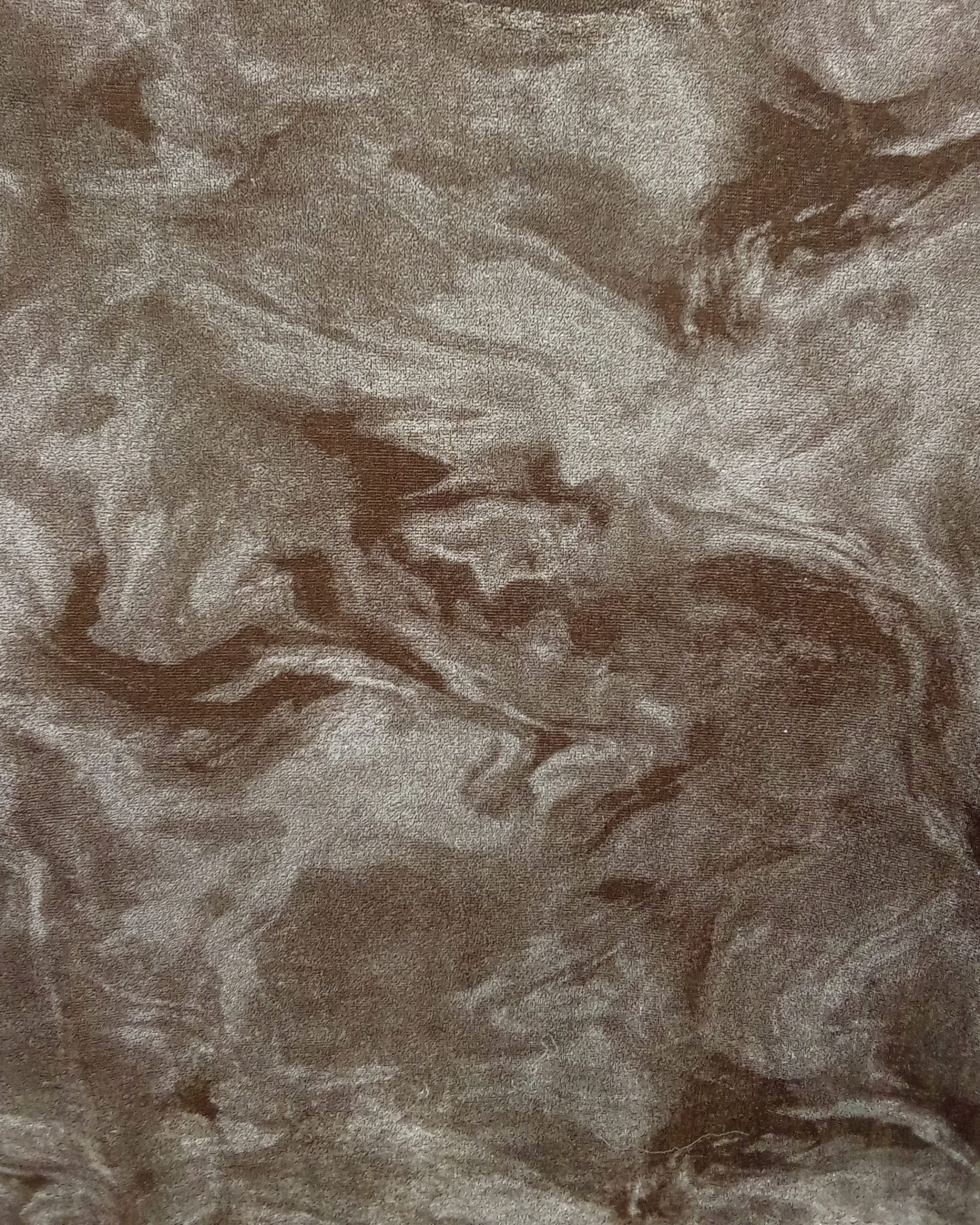 El tejido es aterciopelado y con manchas en blanco y marrón.