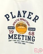 Lleva estampado de pelota de baloncesto amarilla y letras en azul y granate.