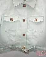Es corta, con bolsillos en el pecho.