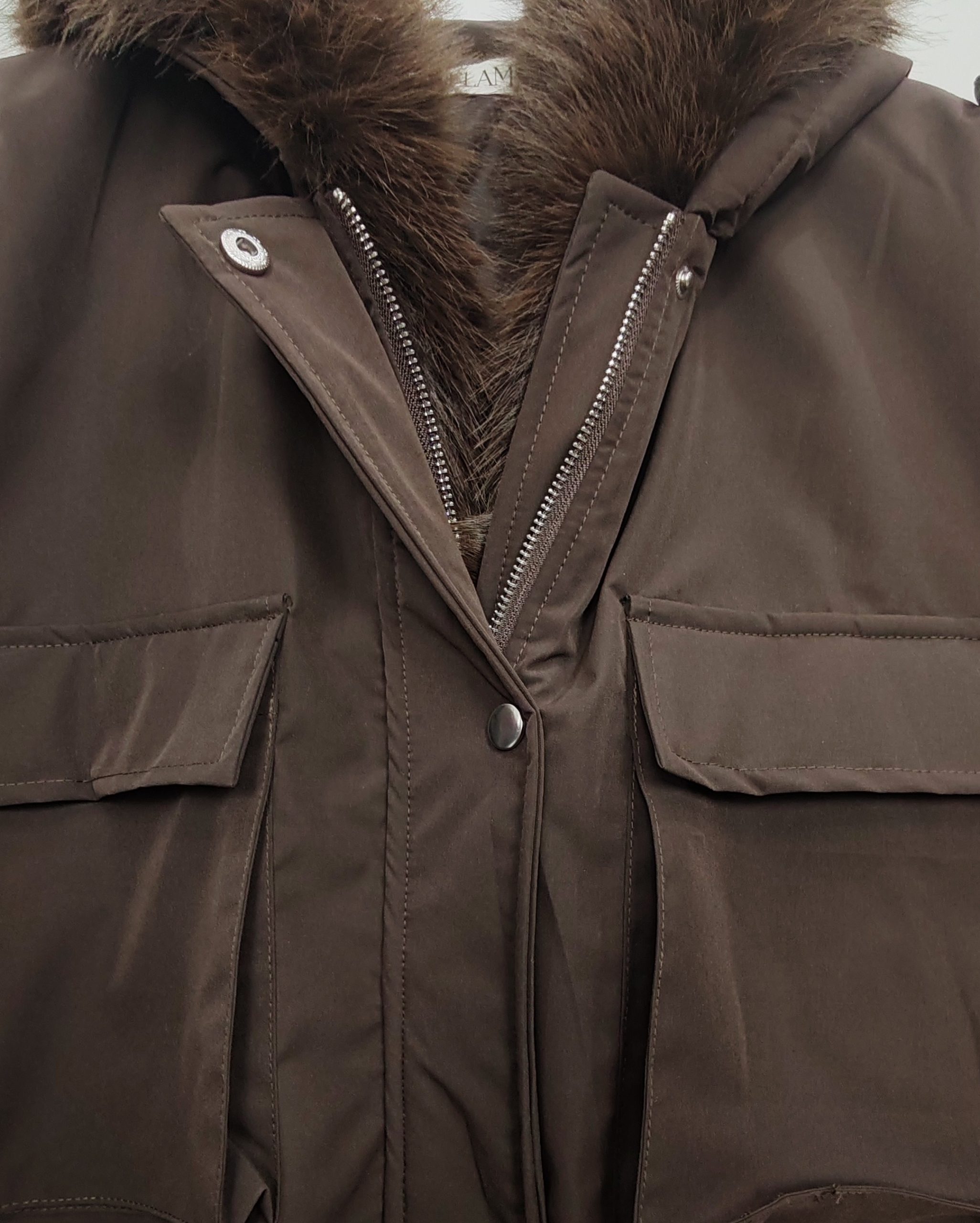 Con bolsillos y cremalleras y tachuelas de color plata.