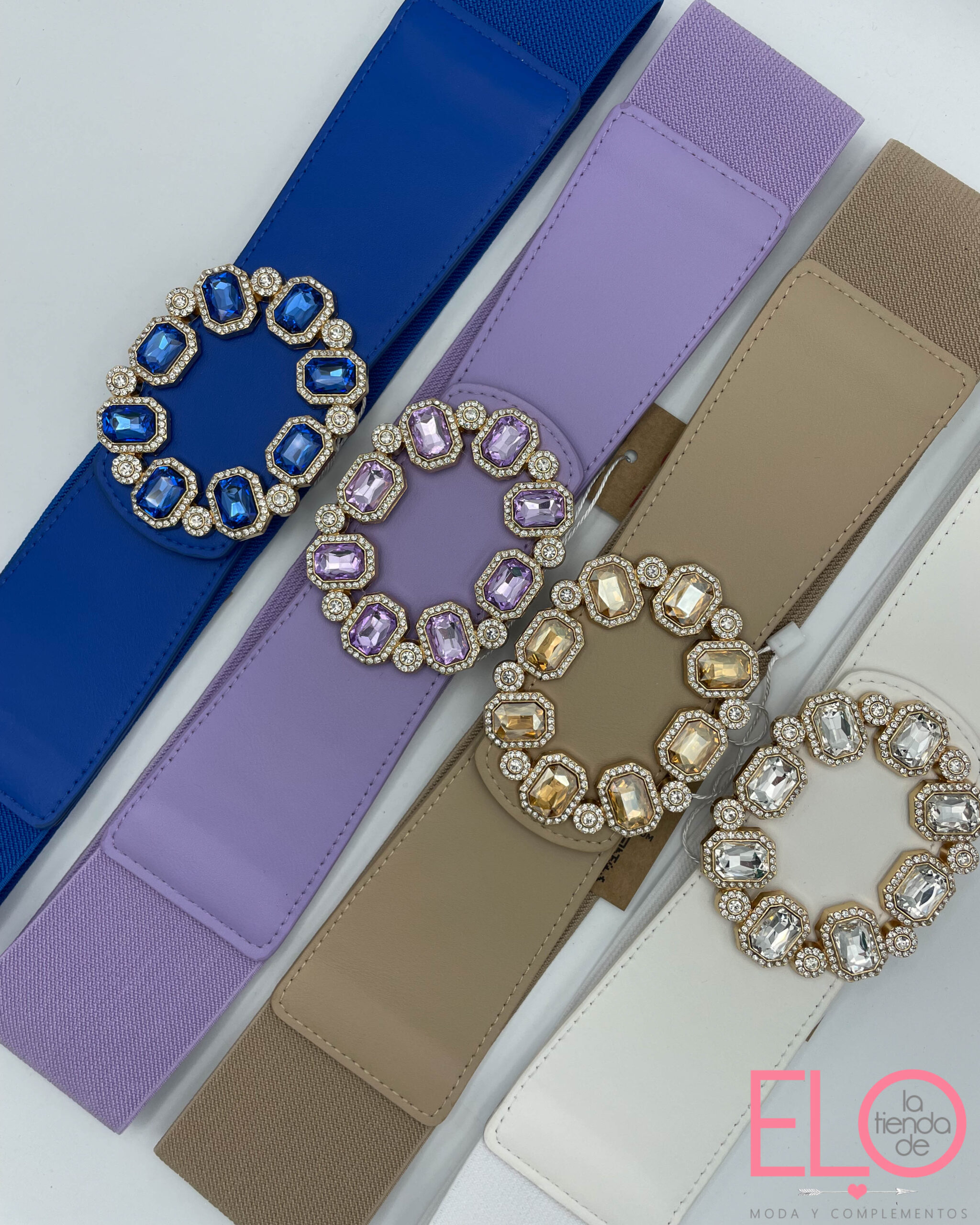 El frente es en polipiel y lleva hebilla circular metálica, decorada con piedras brillantes.