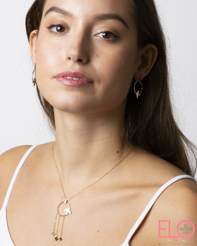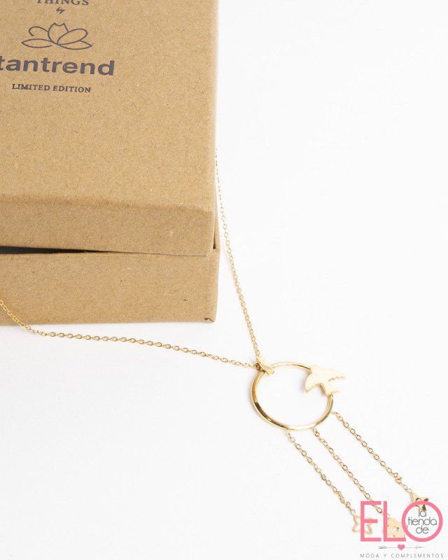Collar de cadena fantasía con colgante de argolla con pequeña ave y lluvia de cadenas con terminación de dijes en motivos varios. en acero inoxidable con baño de oro de 14K. en un color: dorado. una pieza. Composición: acero inoxidable.