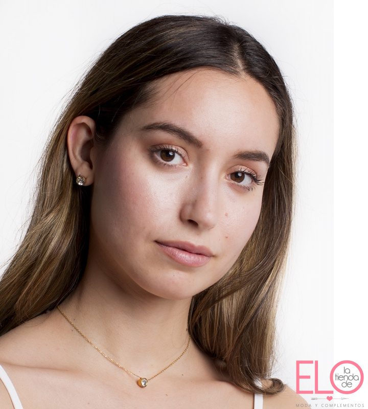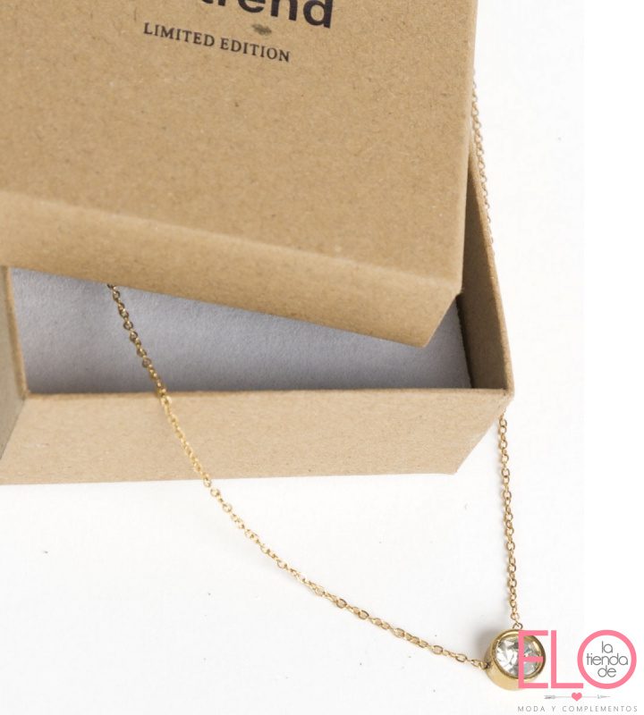 Collar corto “punto de luz” en cadena “o” de eslabones soldados con cristal facetado en centro. de acero inoxidable con baño de oro 14 kilates.