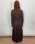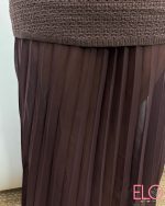 Tiene una falda que es corta de hilo y debajo lleva otra falda plisada y larga.