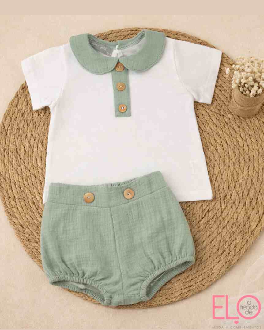 Conjunto de bebé compuesto por camiseta y pantalón corto coordinado, diseñado con un estilo delicado y atemporal.
