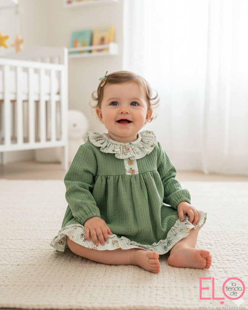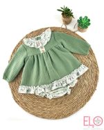 El vestido es de color verde, de manga larga, con volantes de diseño a cuadros.