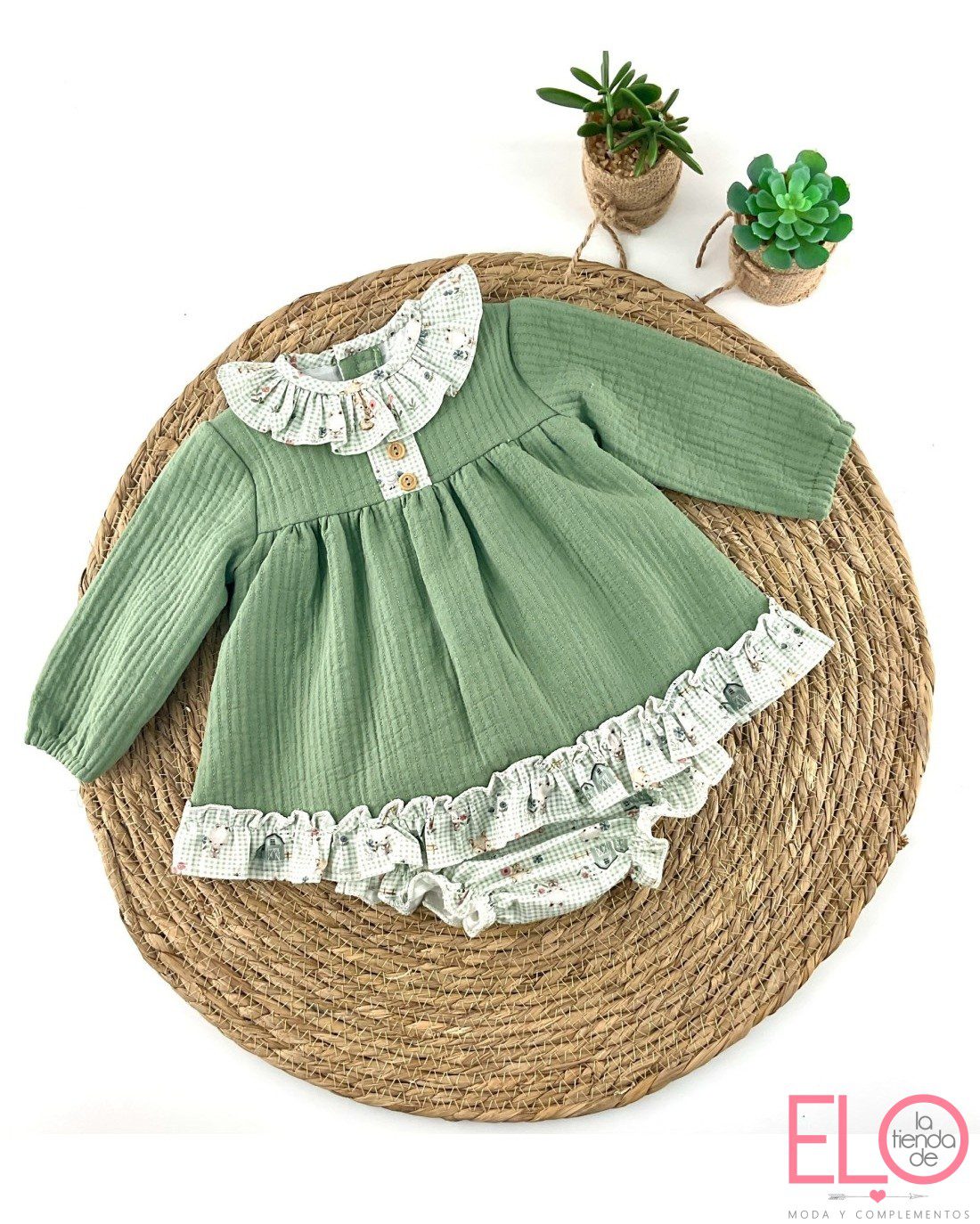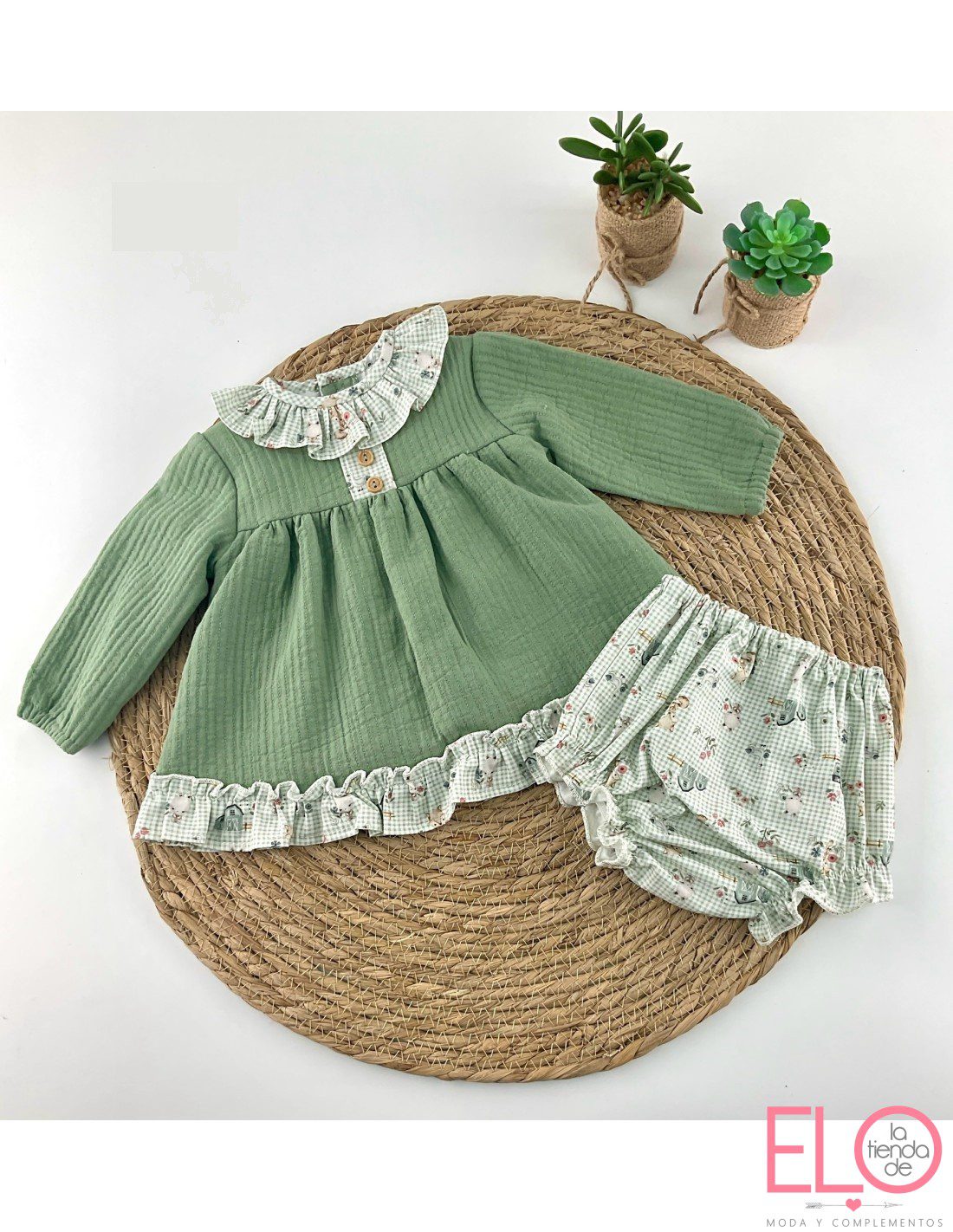 El culetin es a cuadros de color blanco y verde con estampado de animalitos.