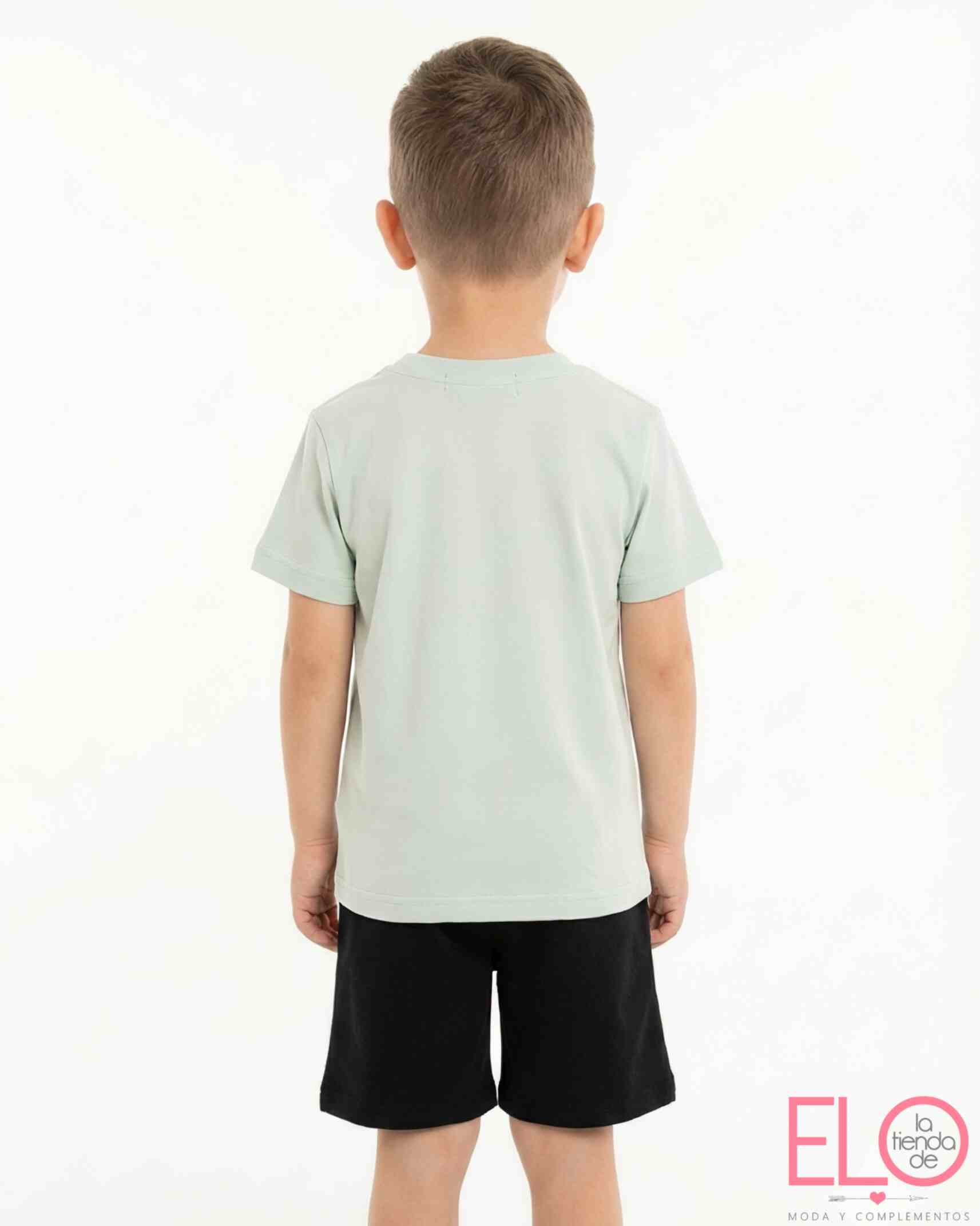 Conjunto de camiseta de color verde mint y bermudas de color negro.