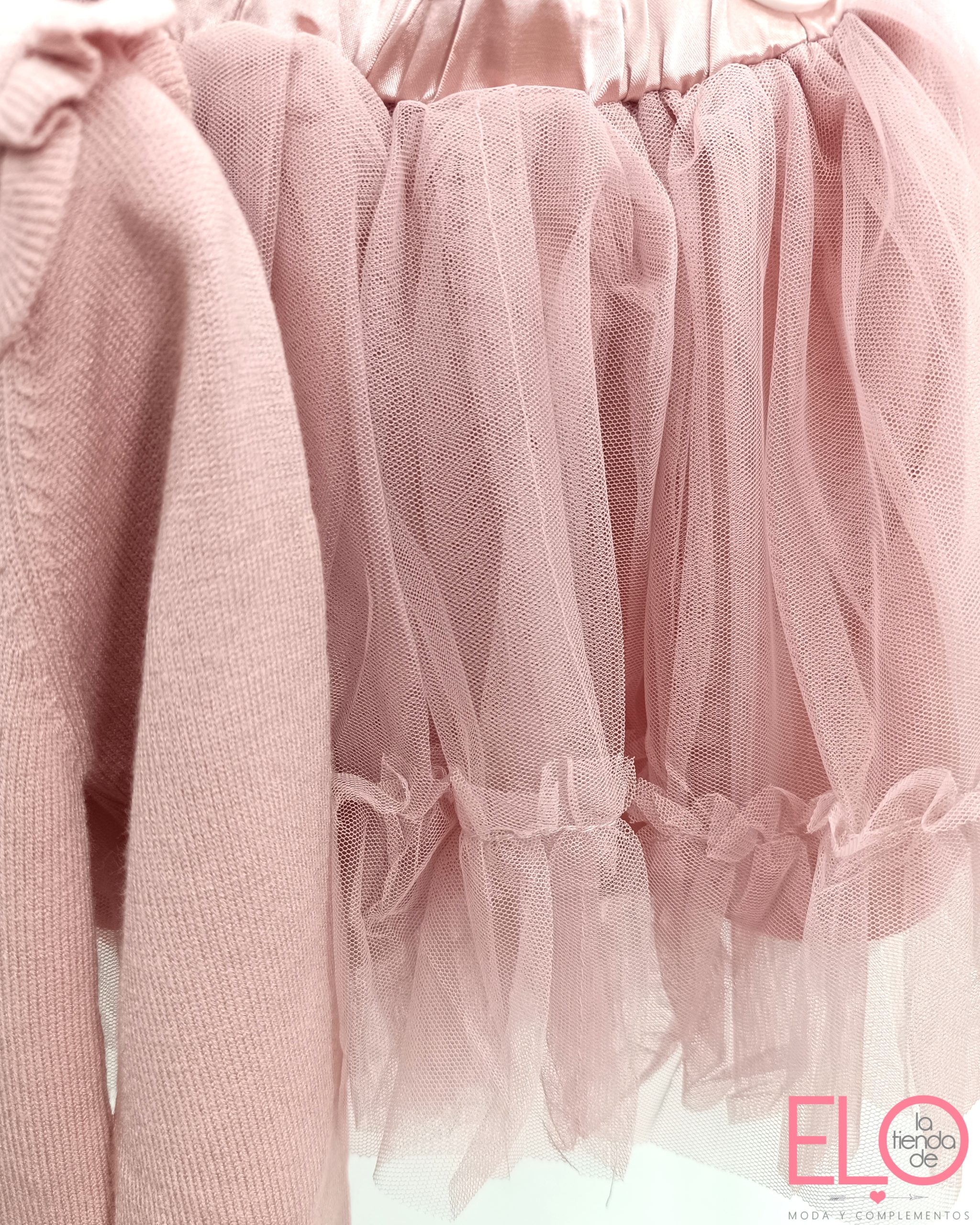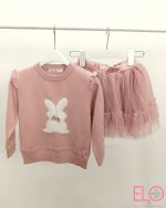 Conjunto de jersey y falda de color rosa.
