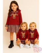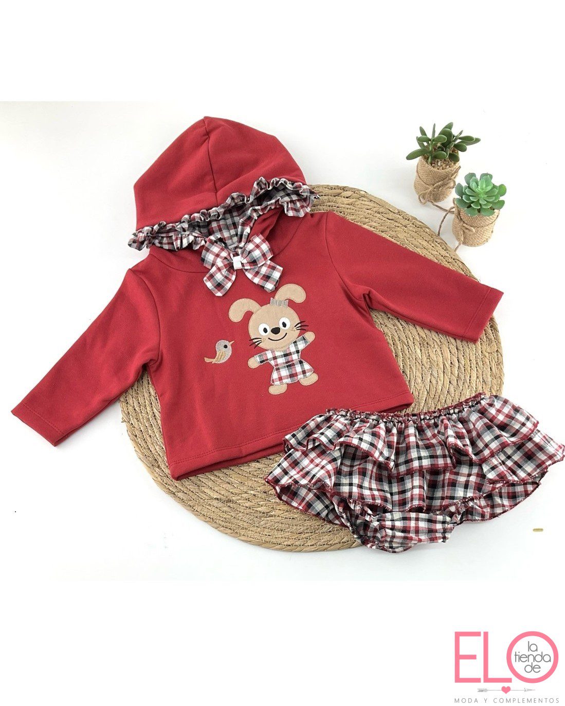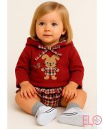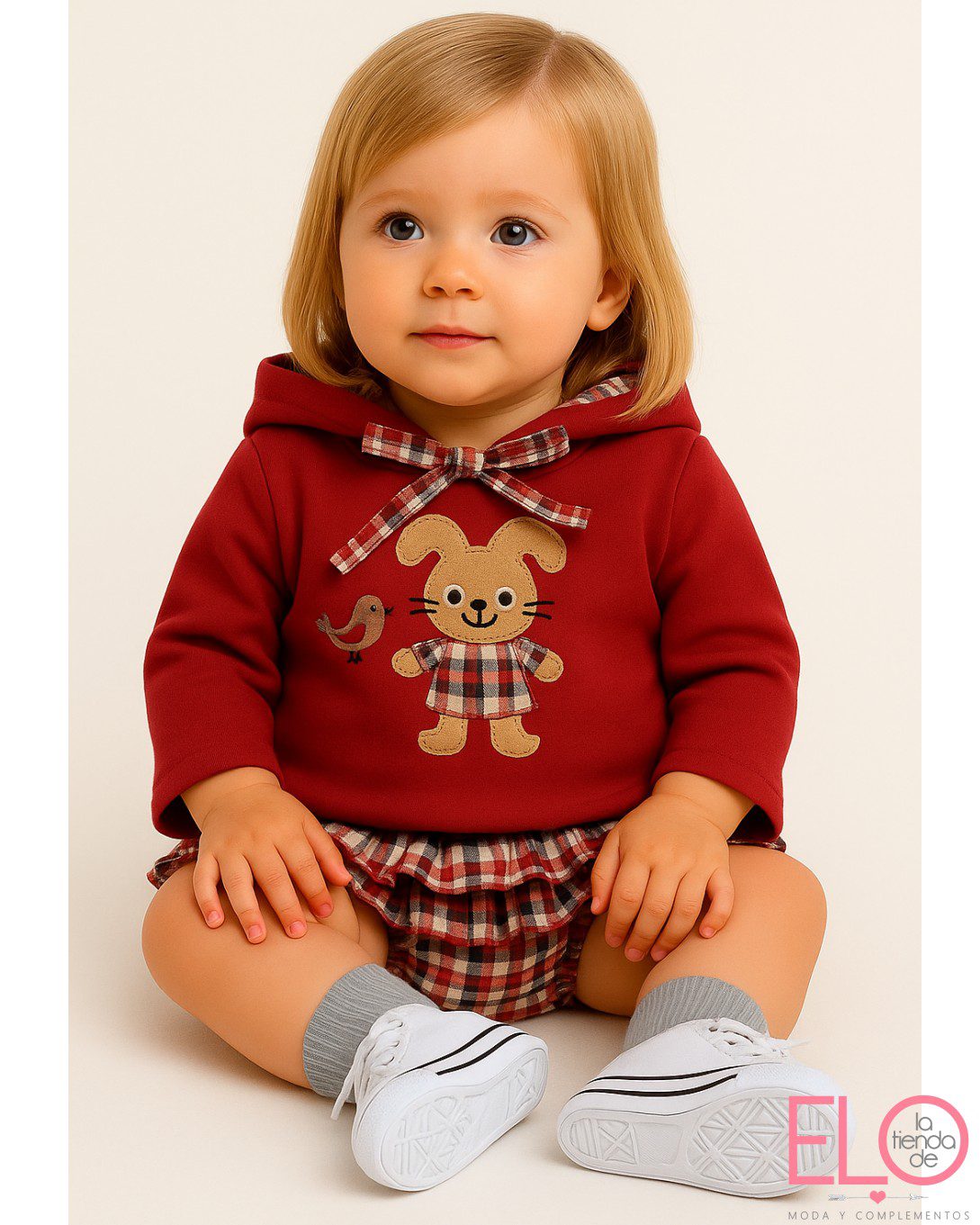 Conjunto de bebé compuesto por sudadera de felpa con pelito interior en color granate, con capucha rematada con volante de cuadros y lazo a juego. El diseño se completa con un bordado de conejito y pajarito, lleno de ternura y detalle.