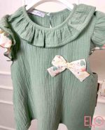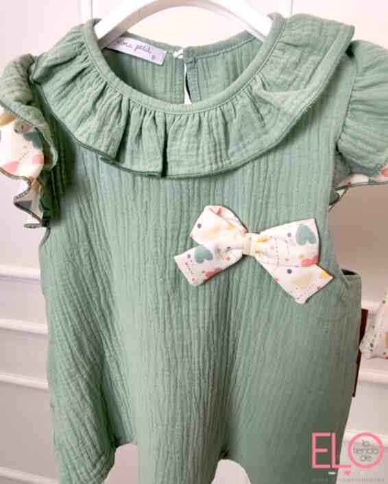 La camisa, confeccionada en bambula verde, destaca por su tejido ligero y suave, con volantes en cuello y hombros que aportan un acabado delicado y elegante. Incorpora lazada decorativa en el frontal a juego con el estampado del conjunto.