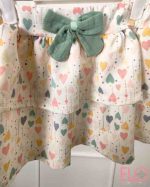 La falda, con estampado de corazones multicolor, presenta volante superpuesto y cinturilla elástica, ofreciendo comodidad y una caída fluida, rematada con lazo central en bambula a tono.