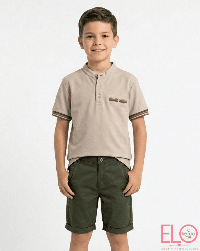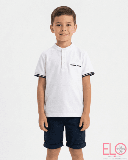 Conjunto infantil para niño compuesto por polo de manga corta y bermuda a juego. Polo en algodón suave y transpirable, cuello mao con tapeta de botones, bolsillo decorativo con vivo en contraste y ribete en mangas que aporta un toque elegante. Bermuda cómoda con cintura adaptable y bajo vuelto, ideal para el día a día o looks más arreglados. Tejido ligero, agradable al tacto y fácil de combinar. Un conjunto versátil, fresco y muy vendible para primavera-verano. Perfecto también como idea de regalo.