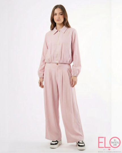 La chaqueta Lleva goma en la cintura, con cremallera de color plata y bolsillos laterales.