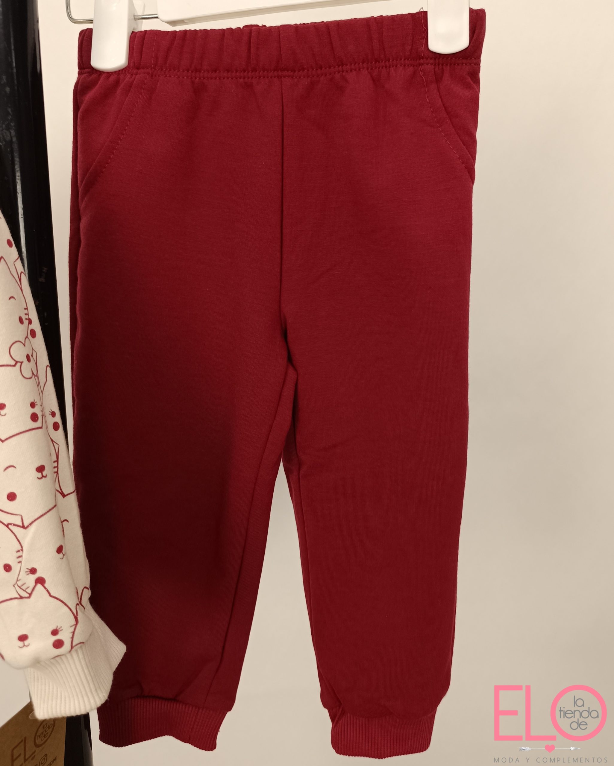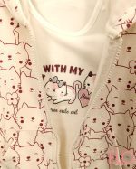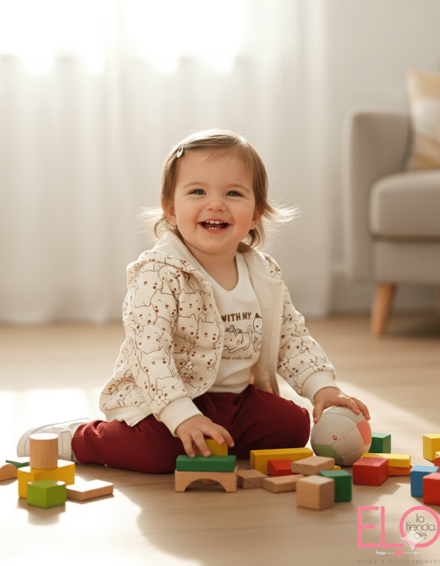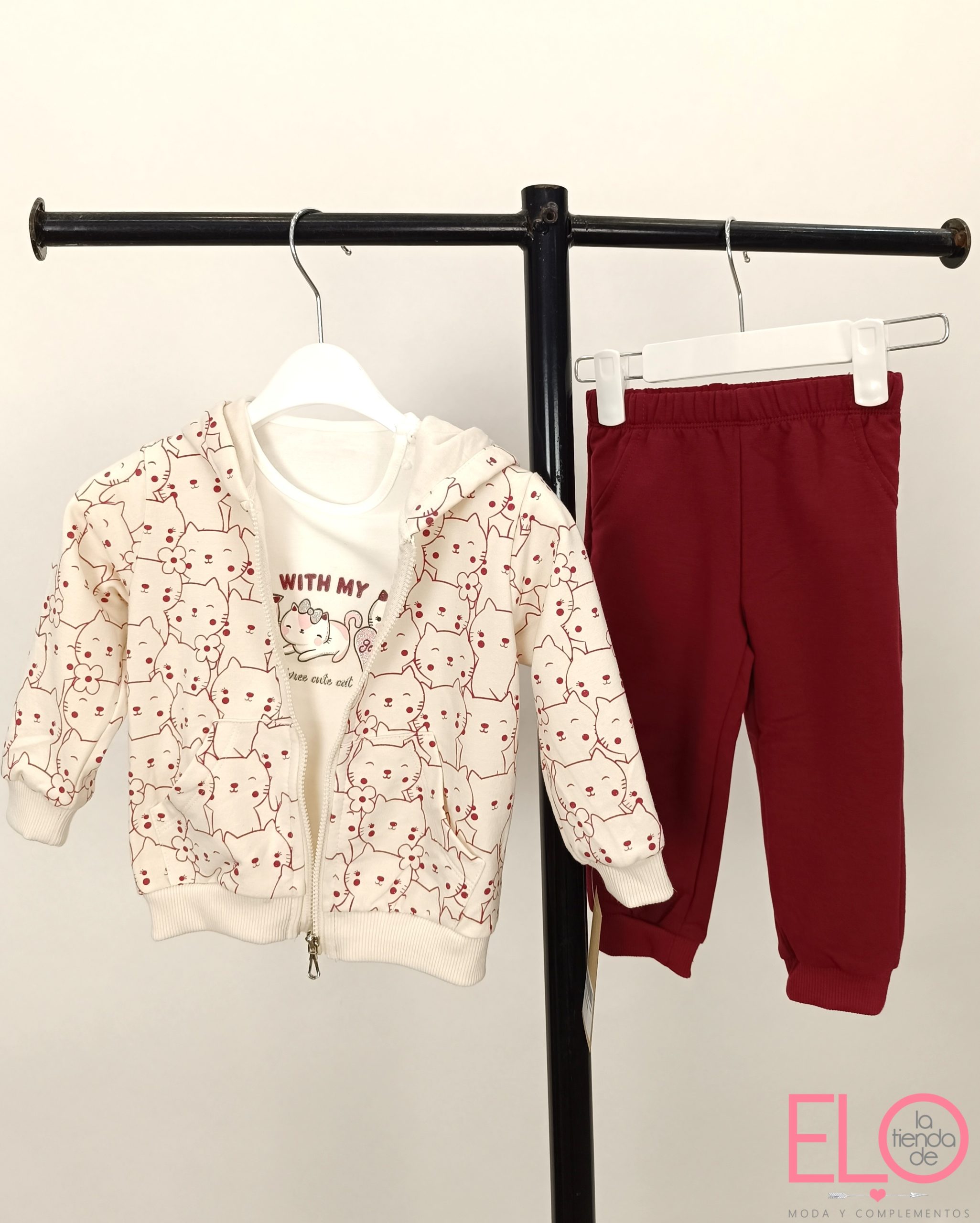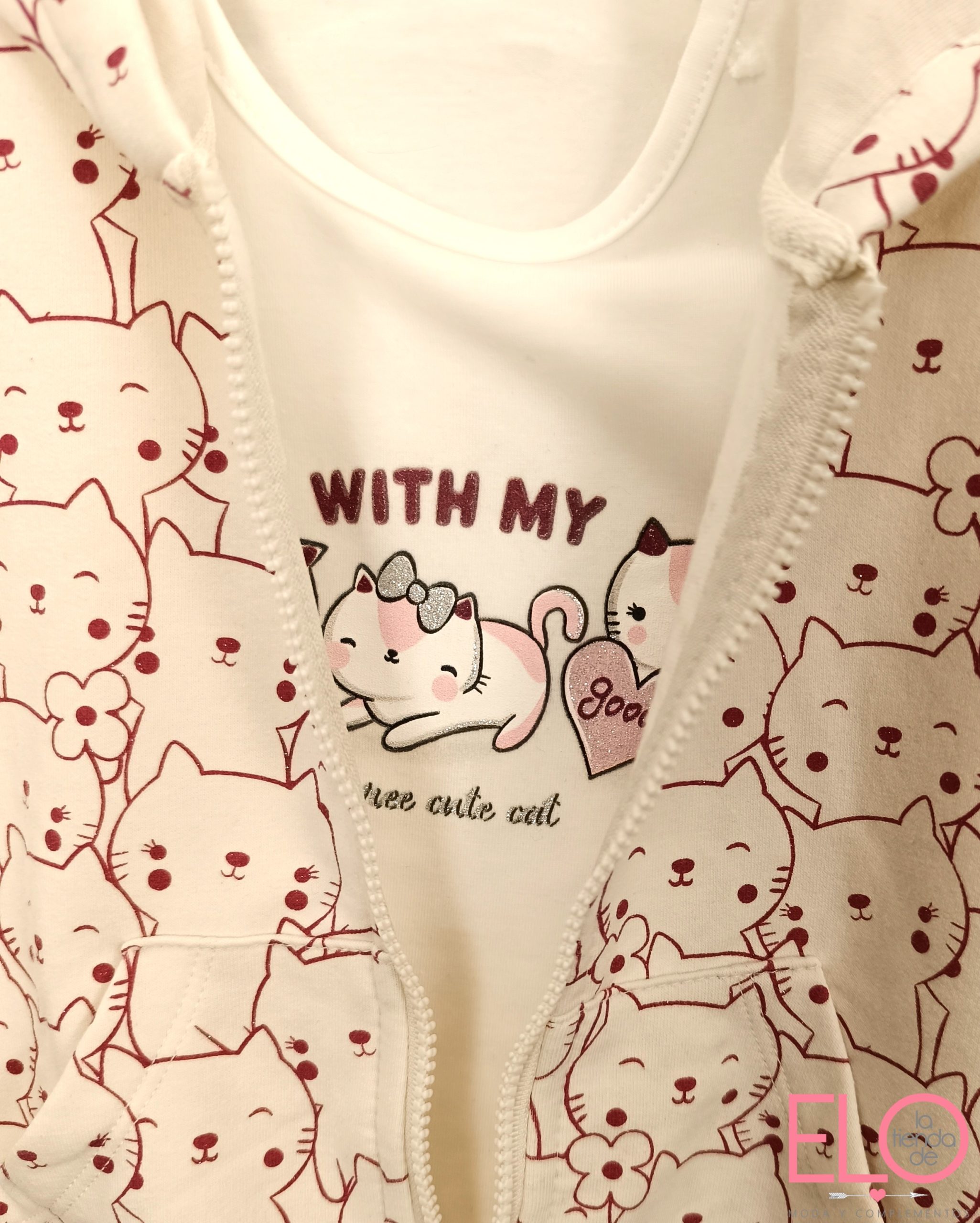 La chaqueta es beige con estampado de gatos rojos. Con cremallera y bolsillos.