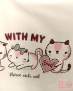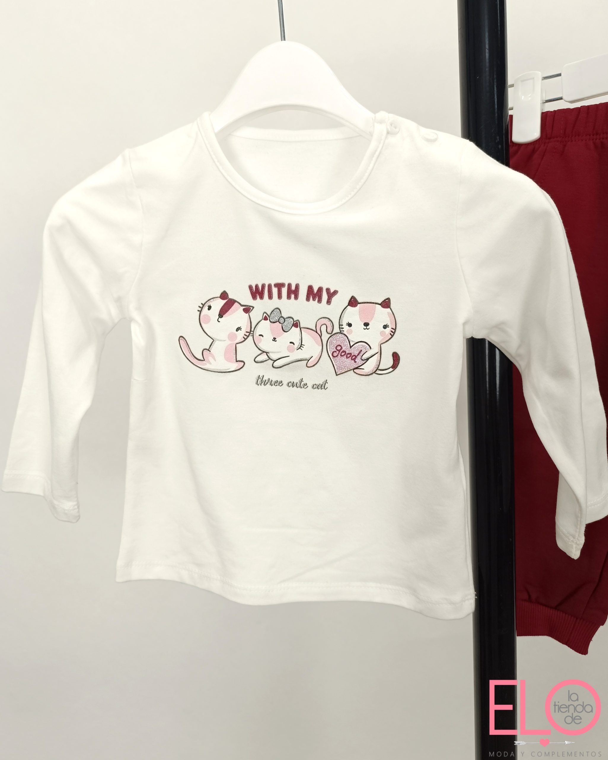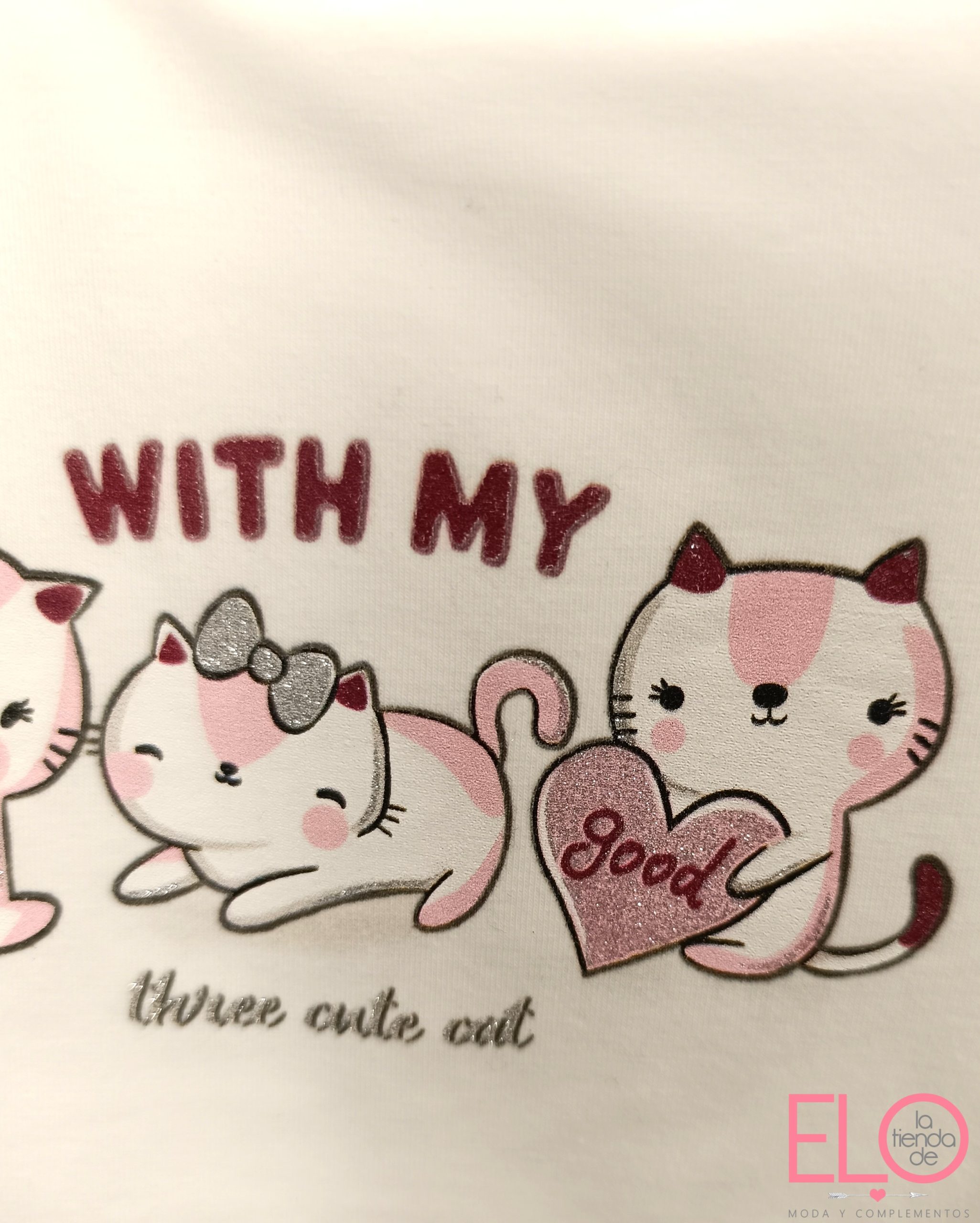 La camiseta es blanca, de manga larga con estampado de gatos rosa con glitter.