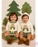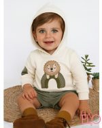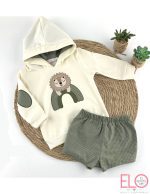La sudadera lleva capucha forrada en popelín a juego, coderas aplicadas en el mismo tejido y bordado central de leoncito sobre arco coordinado en tonos verdes y beige.