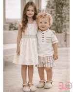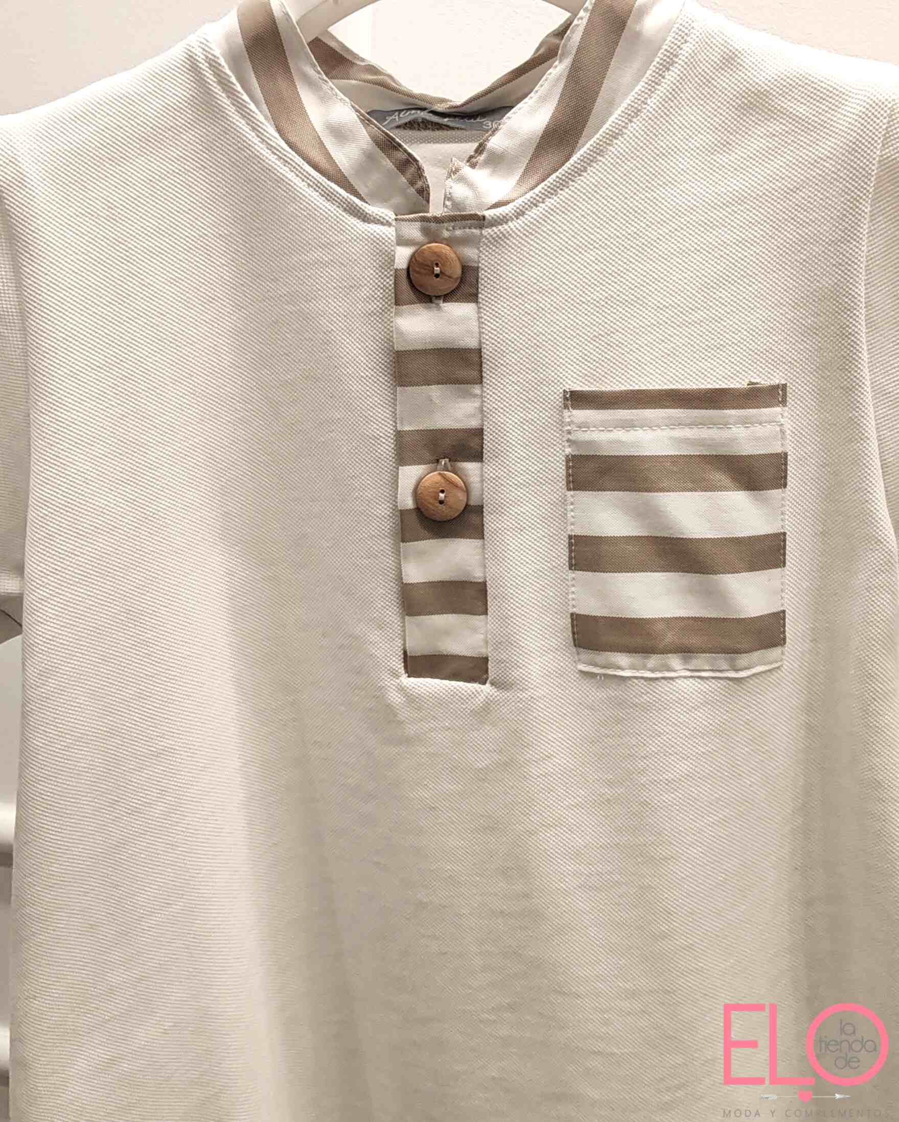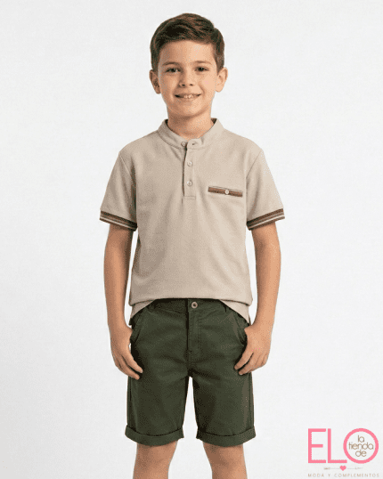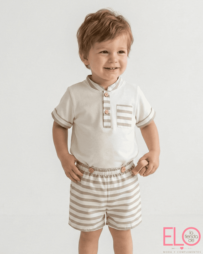 Conjunto de bebé niño Alma Petit compuesto por camiseta en tejido tipo polo y bermuda a rayas. La camiseta, en tono blanco con detalles combinados en beige, presenta cuello mao con tapeta frontal y botones de madera, además de bolsillo delantero coordinado. El tejido polo aporta estructura, comodidad y un acabado más vestido sin perder frescura.