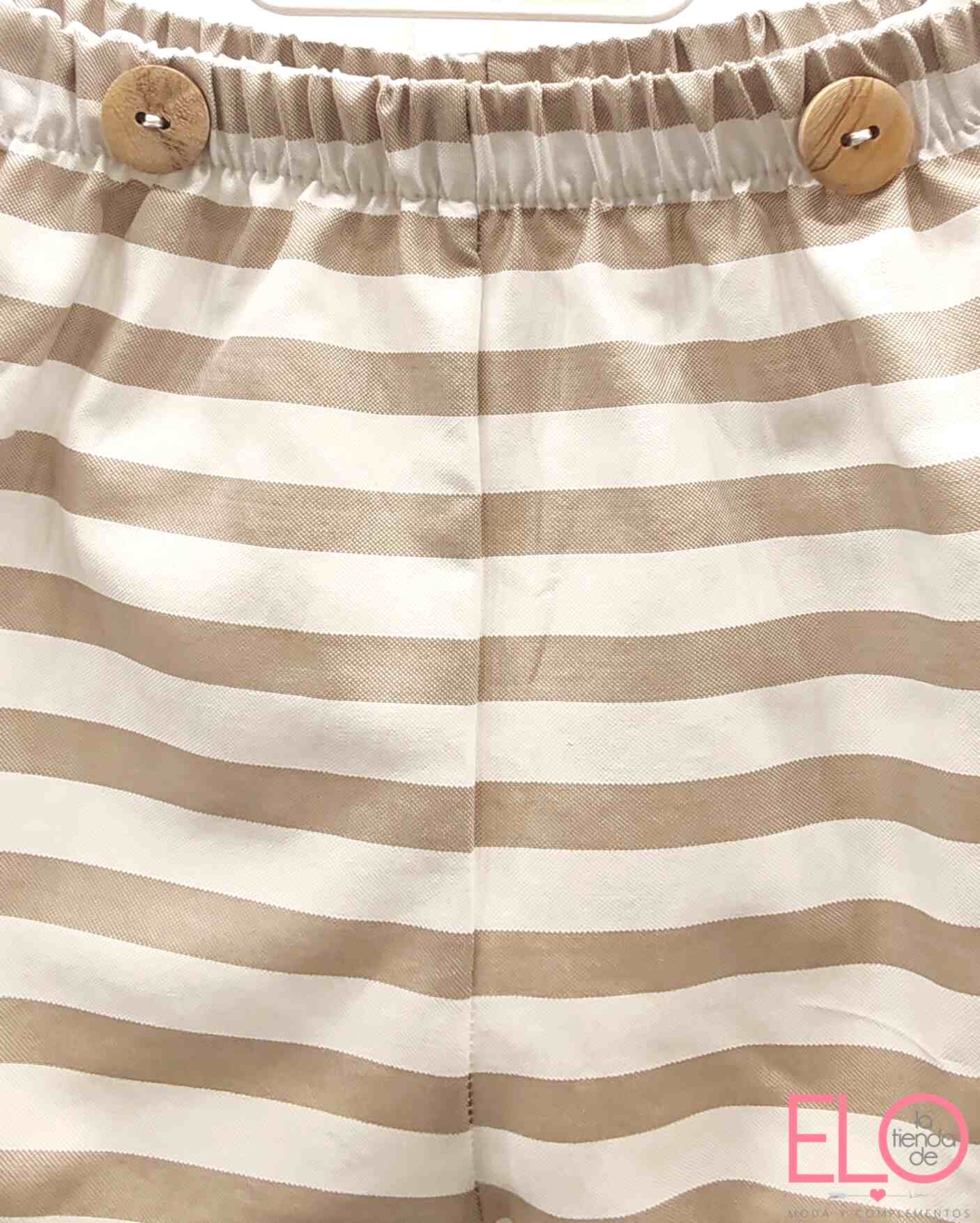 La bermuda, en rayas verticales beige y blanco, incorpora cinturilla elástica y botón decorativo, garantizando ajuste y confort.
