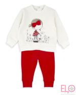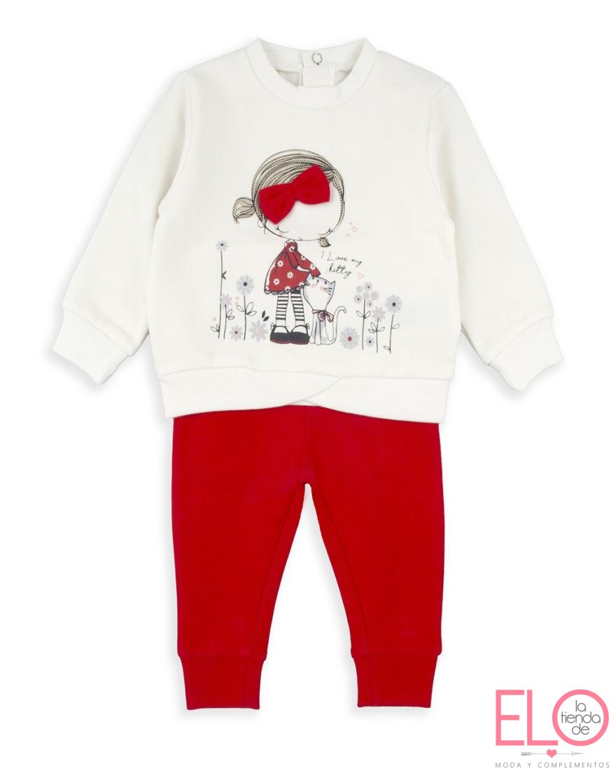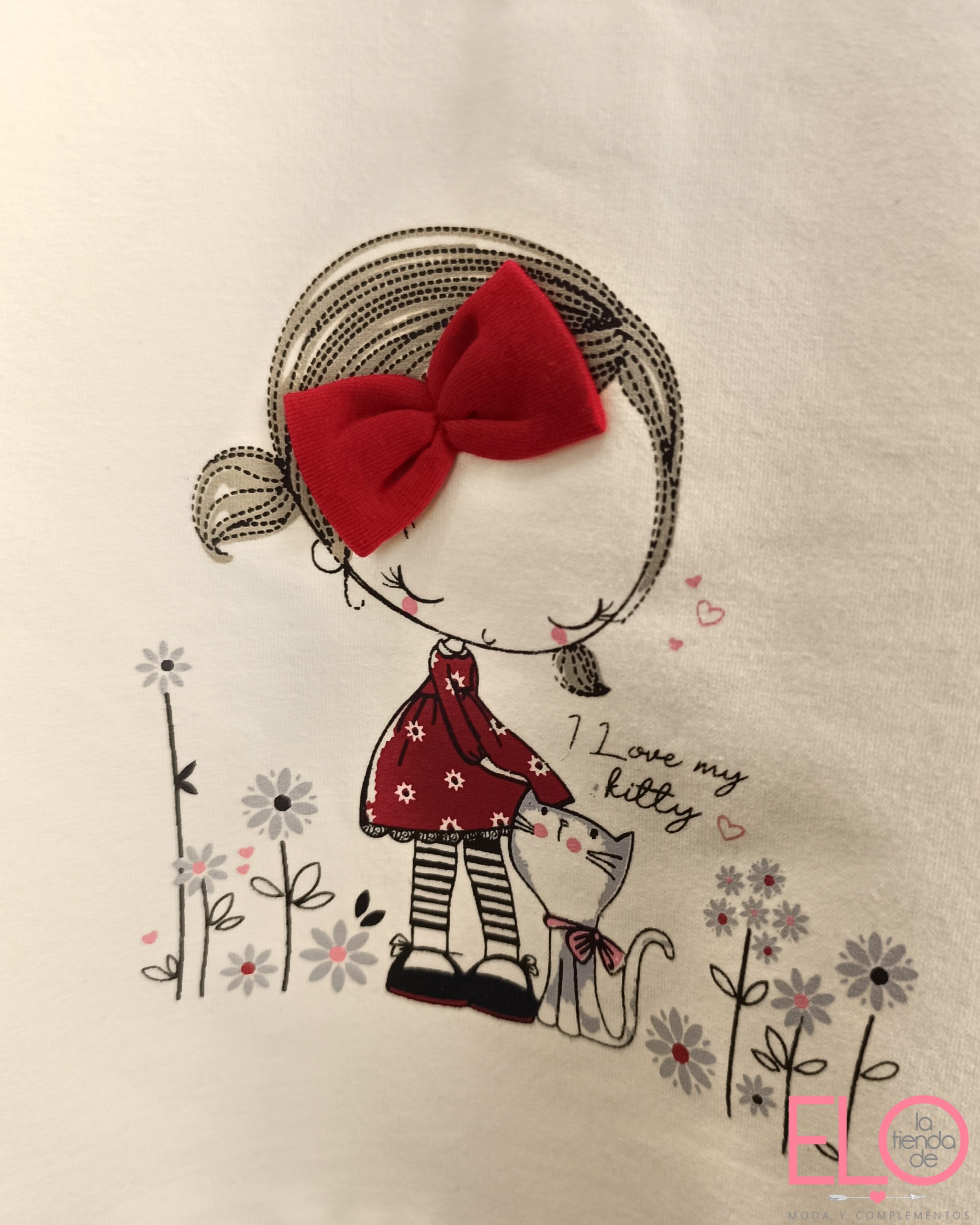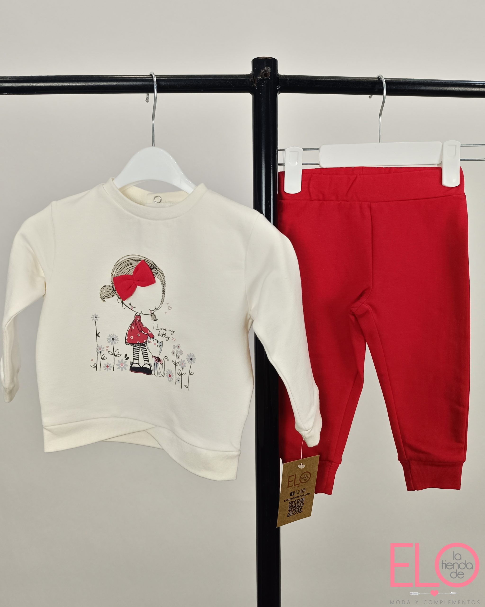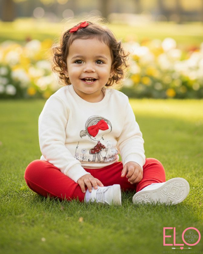 La sudadera es beige con estampado de una nena y lleva un listón rojo.