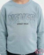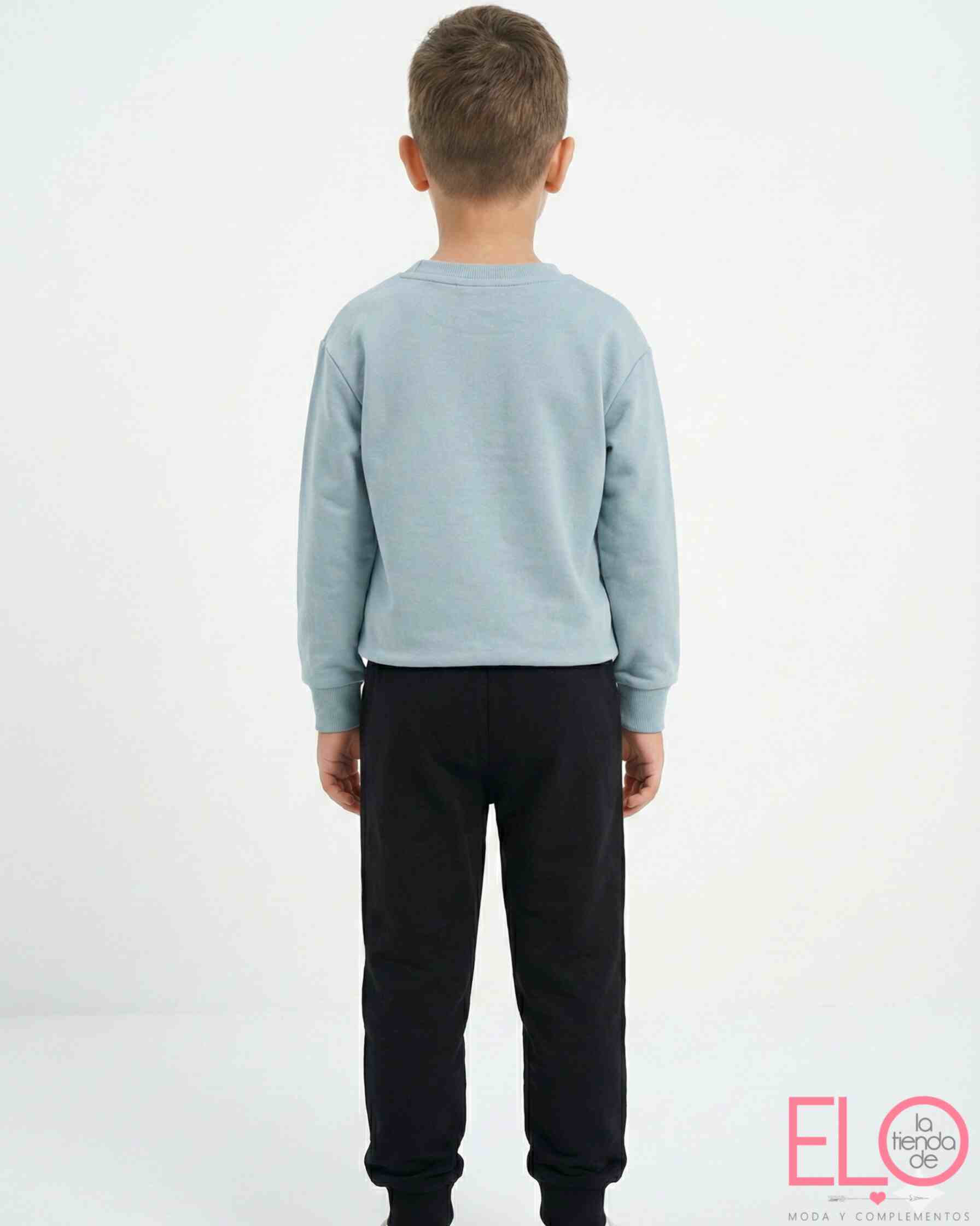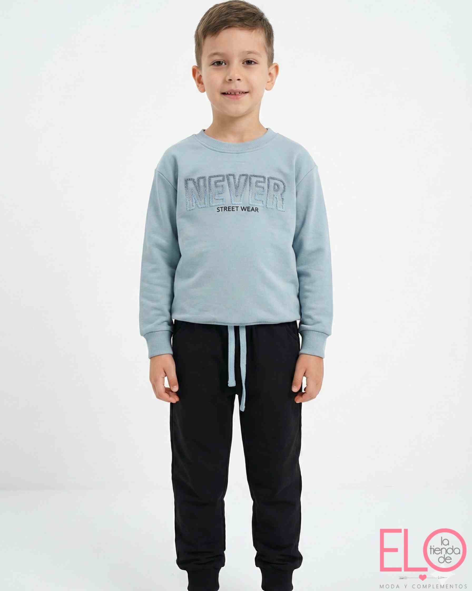 Conjunto infantil de entretiempo compuesto por sudadera de felpa ligera y pantalón largo de punto. Sudadera de cuello redondo con puños y bajo elásticos y estampado frontal “NEVER” de estilo urbano. Pantalón en color marino con cintura elástica y cordón ajustable para mayor comodidad, bajos rematados en puño. Tejido suave, flexible y resistente, ideal para el día a día, colegio o paseos. Un look deportivo y moderno fácil de combinar con zapatillas. Disponible de la talla 4 a la 12.